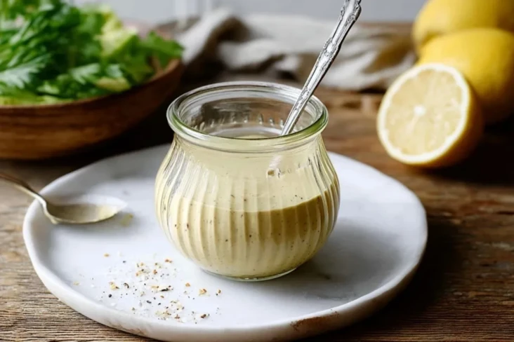 Das Dressing dickt im Kühlschrank leicht nach – einfach mit etwas Wasser oder Zitronensaft erneut glattrühren.