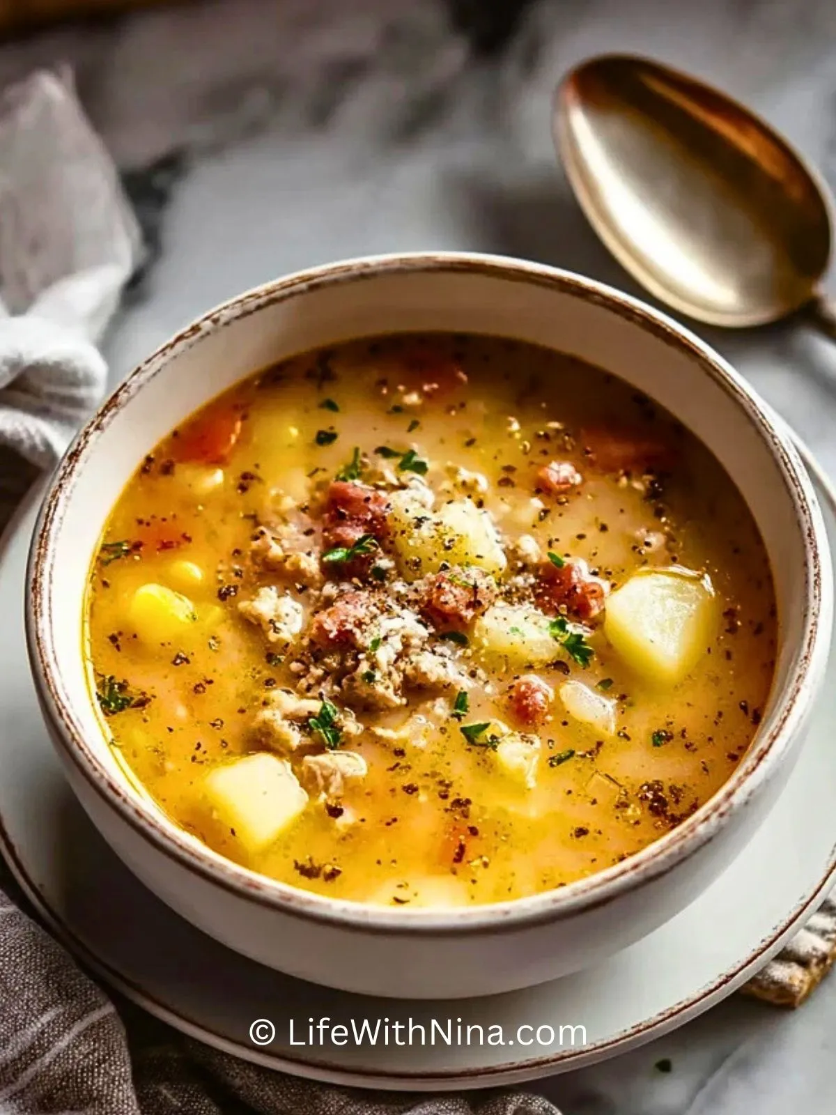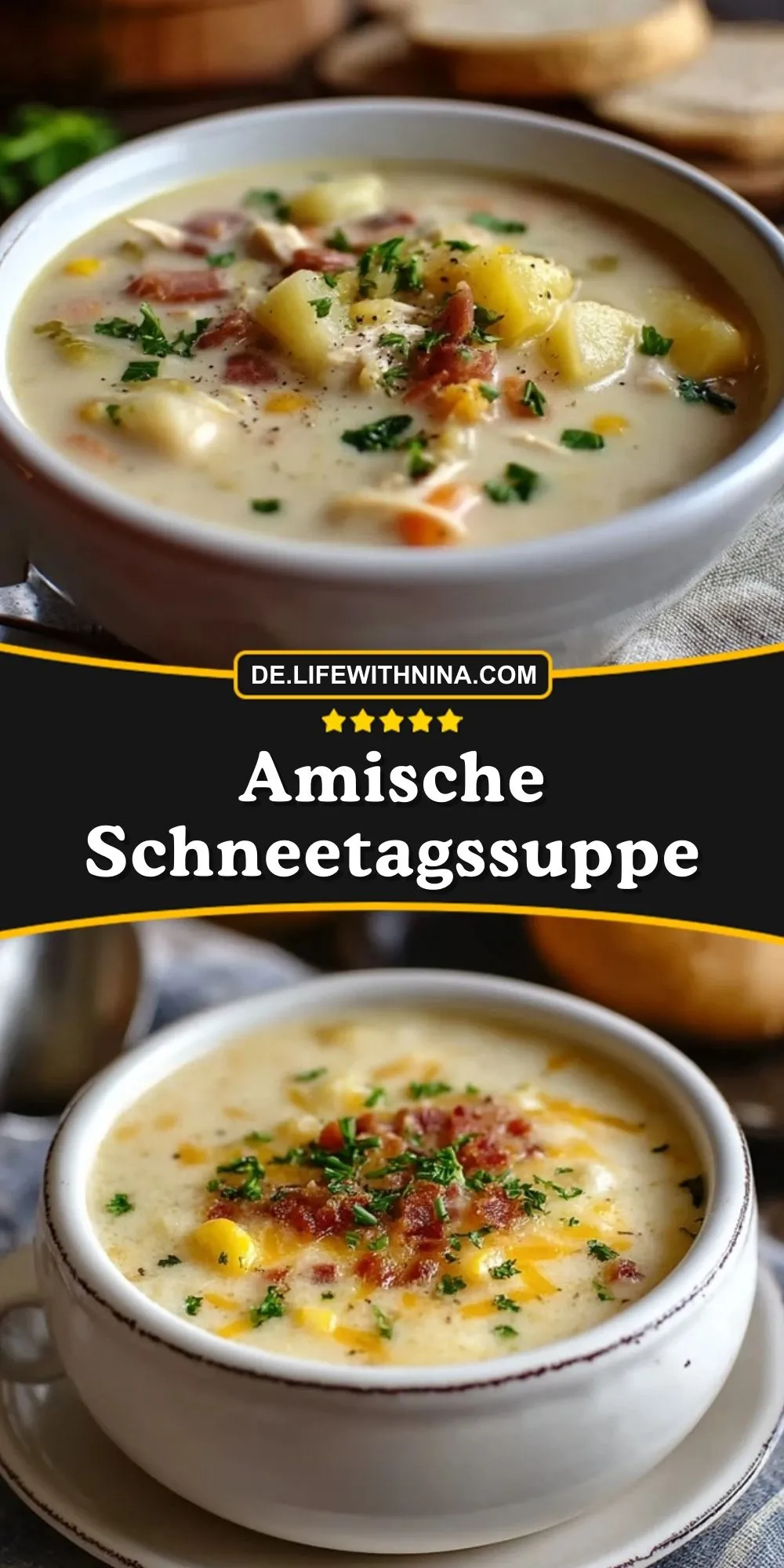 - Cremige Kartoffel-Mais-Suppe mit knusprigem Bacon-Topping.