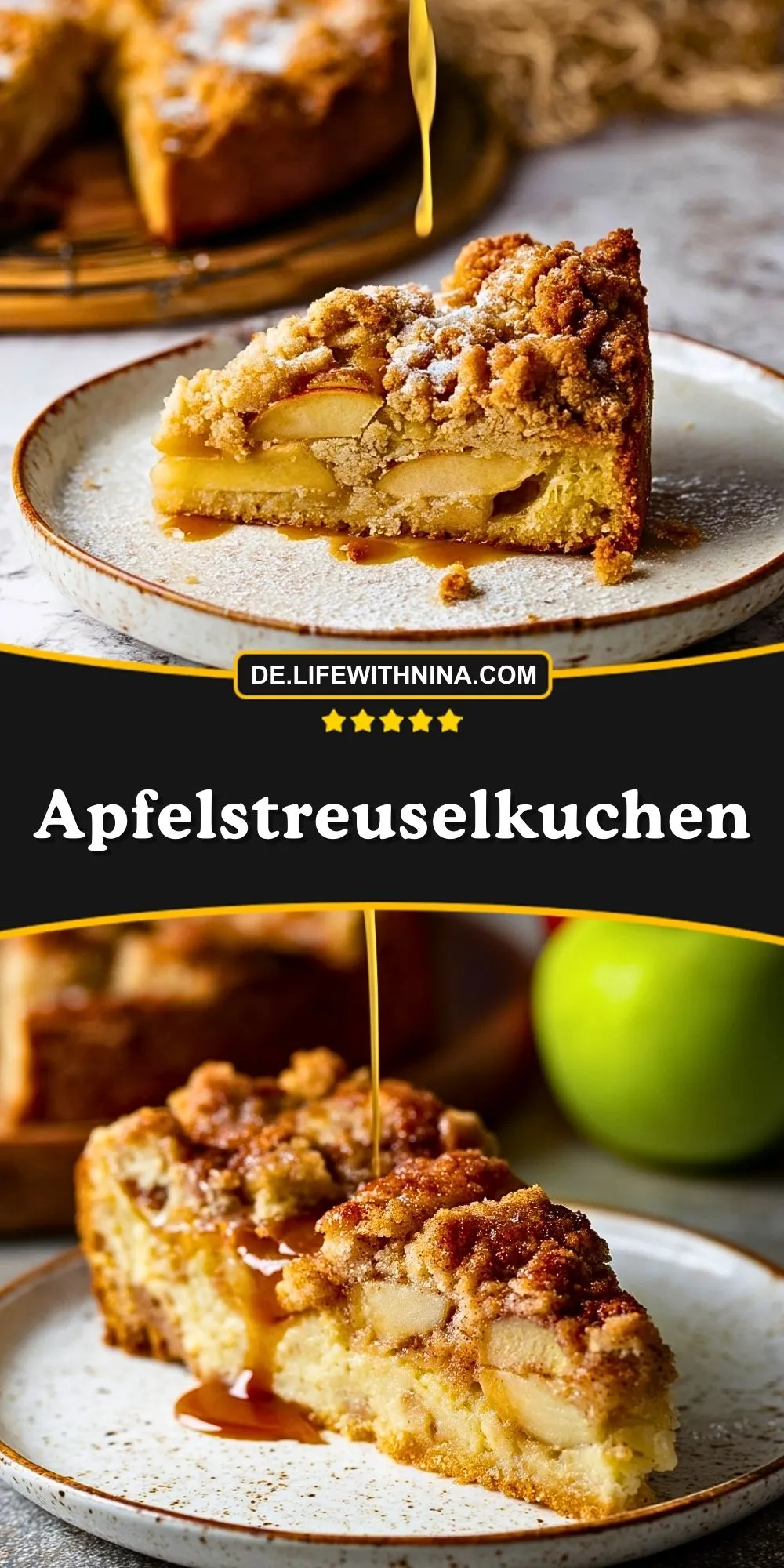 Klassischer Apfelstreuselkuchen mit lockerem Rührteig, saftigen Äpfeln und knusprigen Butterstreuseln.
