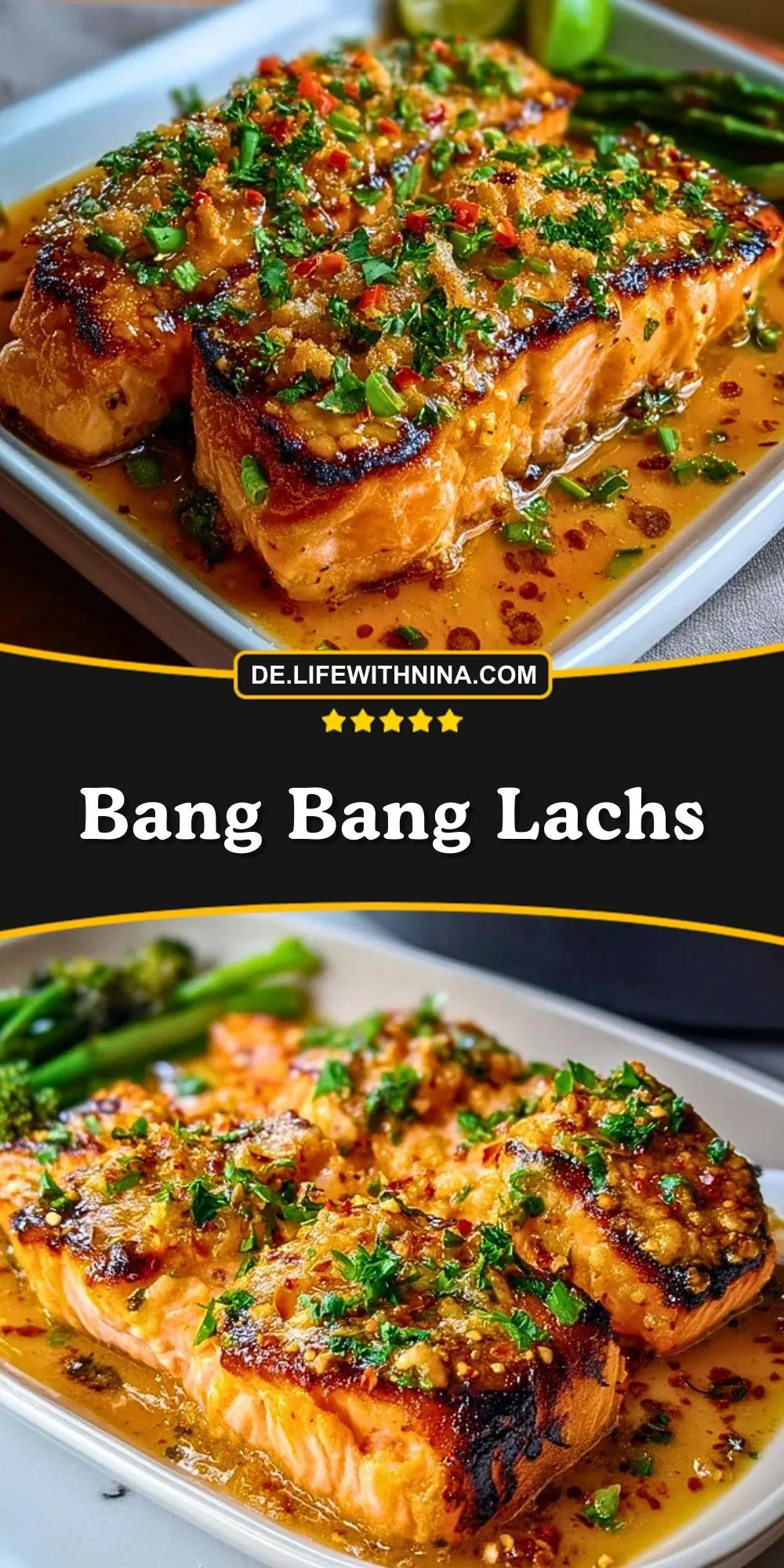 Bang Bang Lachs ist ein schnell gemachtes Ofengericht mit saftigem Lachs und einer cremig-scharfen Sauce aus Mayonnaise, süßer Chilisauce, Sriracha und Limette. Die Glasur karamellisiert leicht im Ofen, sodass der Fisch außen würzig und aromatisch, innen aber butterzart bleibt – perfekt für ein unkompliziertes, besonderes Abendessen.