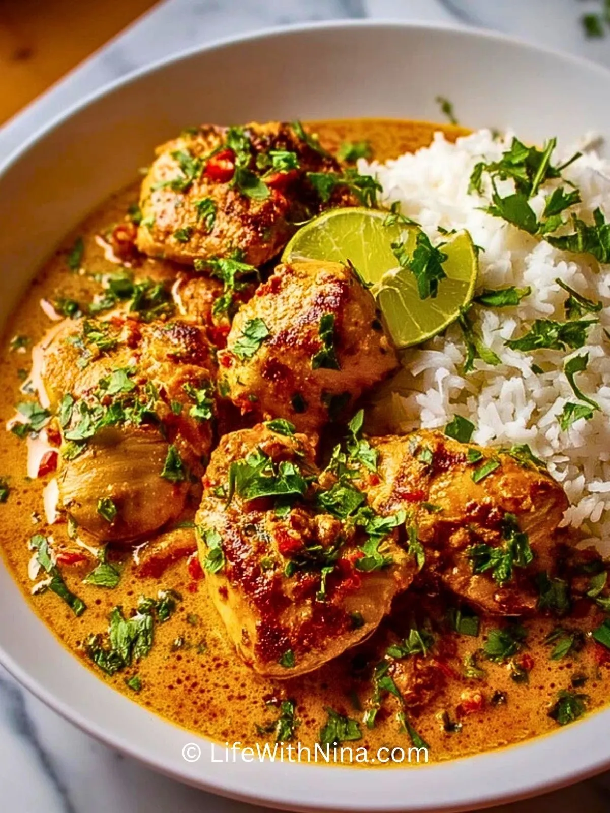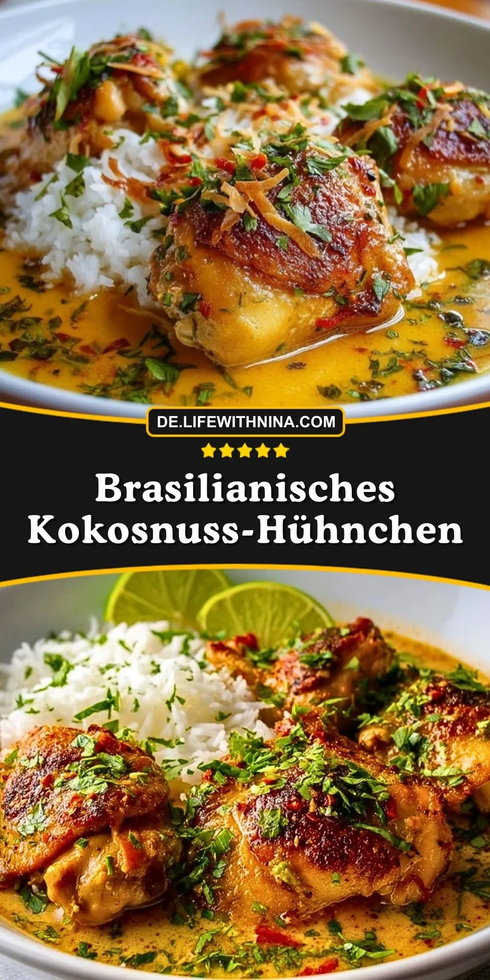 Ein aromatisches brasilianisches Gericht: Zartes Hähnchen in cremiger Kokossauce mit frischem Koriander, Chili und Limette. Perfekt für ein exotisches Abendessen, das sich unkompliziert zubereiten lässt und mit duftendem Reis serviert wird.