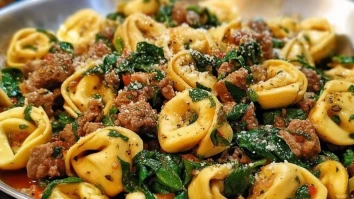 Herzhafte Knoblauchbutter-Rindfleisch- und Spinat-Tortellini