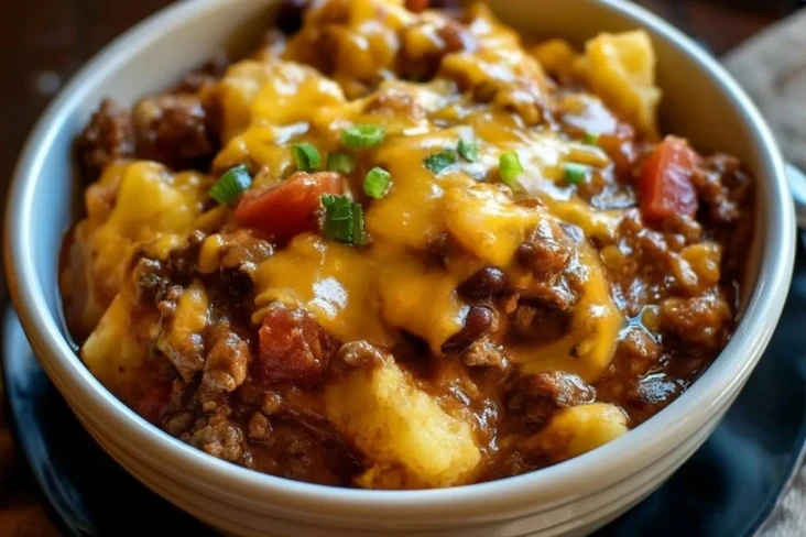 Den Cowboy Auflauf etwa 20–25 Minuten im Ofen backen, bis der Käse goldgelb geschmolzen ist. Nach Belieben mit Frühlingszwiebeln garnieren und sofort servieren.