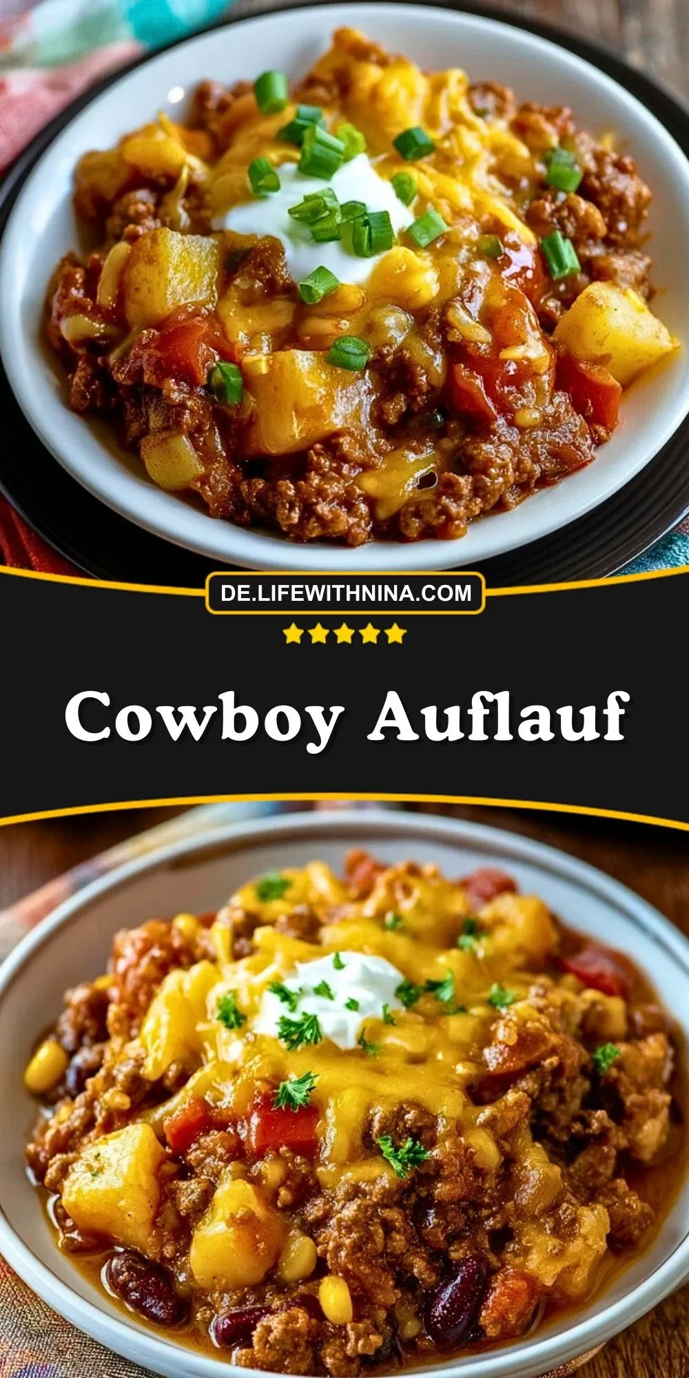 Deftiger Cowboy Auflauf: Ein rustikaler, würziger Auflauf mit Hackfleisch, Kartoffeln, Bohnen, Tomaten und Cheddarkäse. Perfekt als Familiengericht, für Partys oder einfach als wohliges Abendessen – einfach gemacht und herrlich aromatisch!