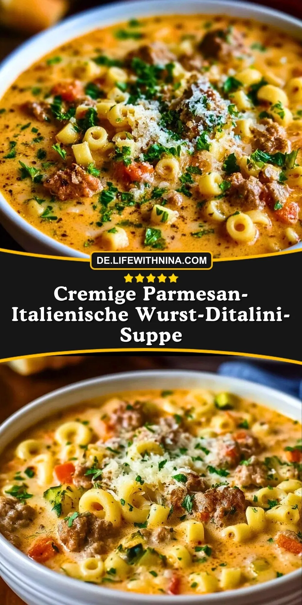 Cremige Parmesan-Italienische Wurst-Ditalini-Suppe ist ein italienischer Suppentraum aus würziger Bratwurst, zartem Gemüse, kleinen Ditalini-Nudeln und einer herrlich cremigen Parmesan-Brühe. Ein echtes Wohlfühlgericht für jede Jahreszeit.