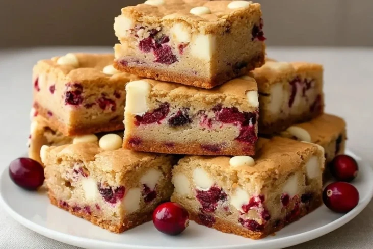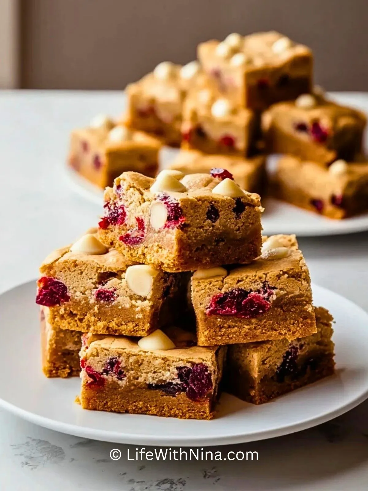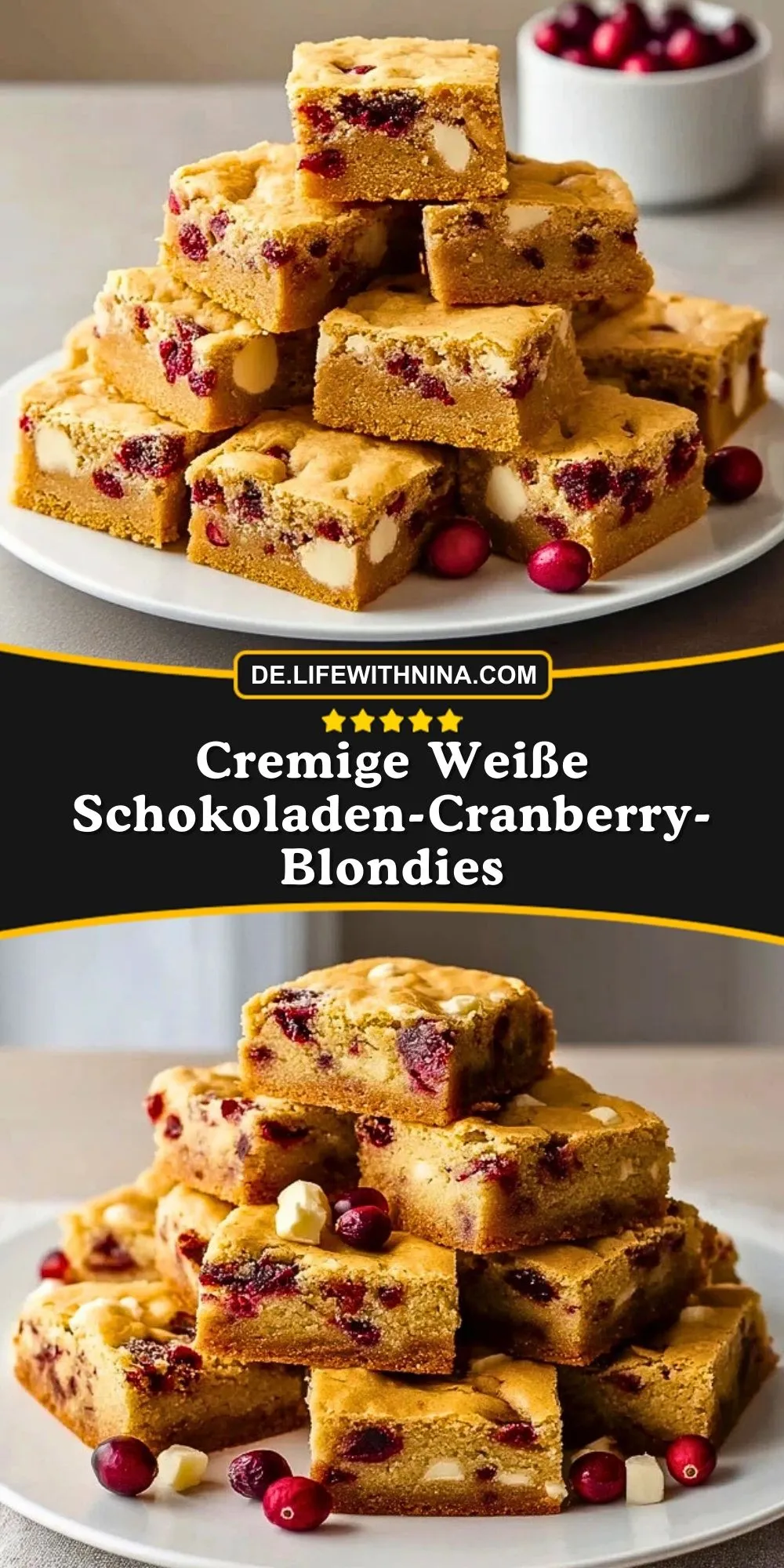 Cremige, zarte Blondies mit weißer Schokolade und fruchtigen Cranberries. Perfekt als winterlicher Snack, für die Kaffeetafel oder einfach zwischendurch – besonders saftig und aromatisch.