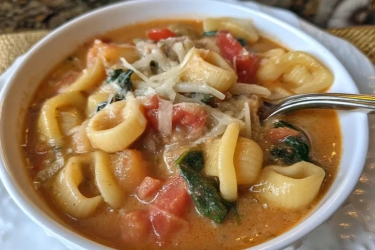 Diese cremige Nudelsuppe ist ein einfaches, wärmendes Wohlfühlgericht mit zarten Nudeln, aromatischer Tomaten-Sahne-Brühe, frischem Spinat und Parmesan. Sie ist schnell gemacht, wunderbar herzhaft und ideal für ein unkompliziertes Mittag- oder Abendessen, wenn es gemütlich und richtig lecker sein soll.