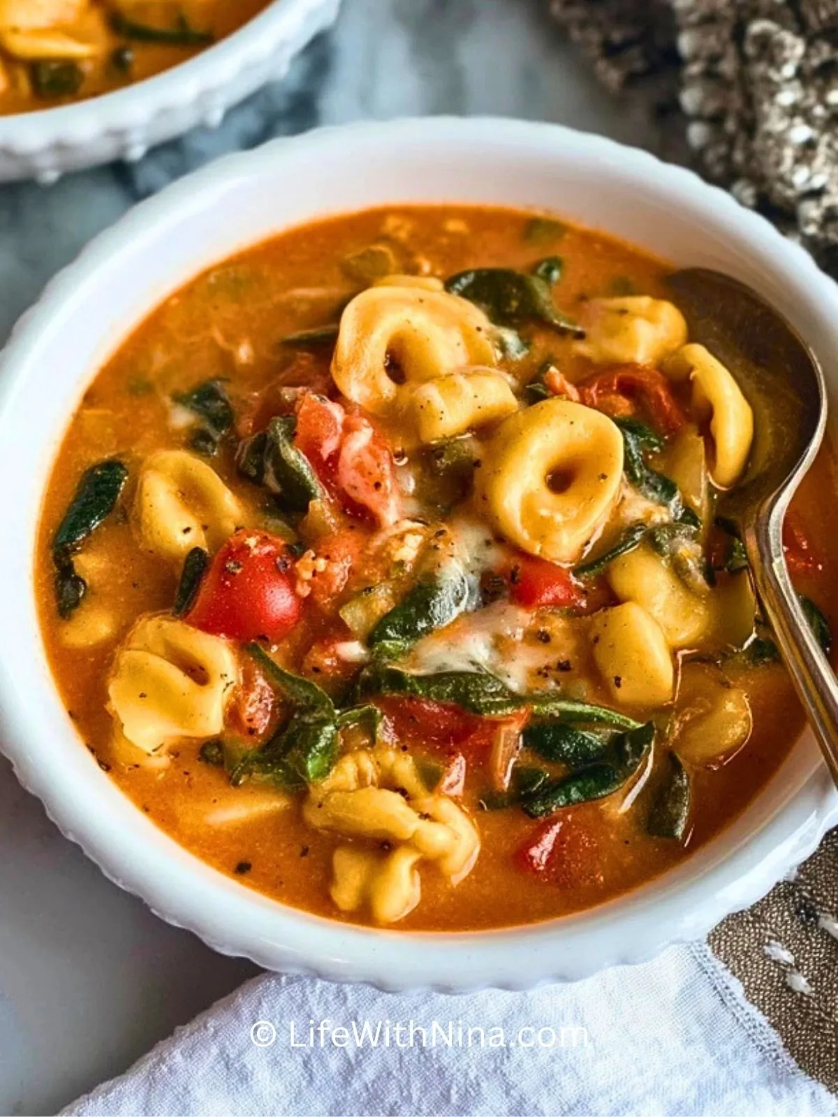 Cremige Tortellini-Suppe mit Spinat für noch mehr Fülle und eine besonders zarte Einlage.