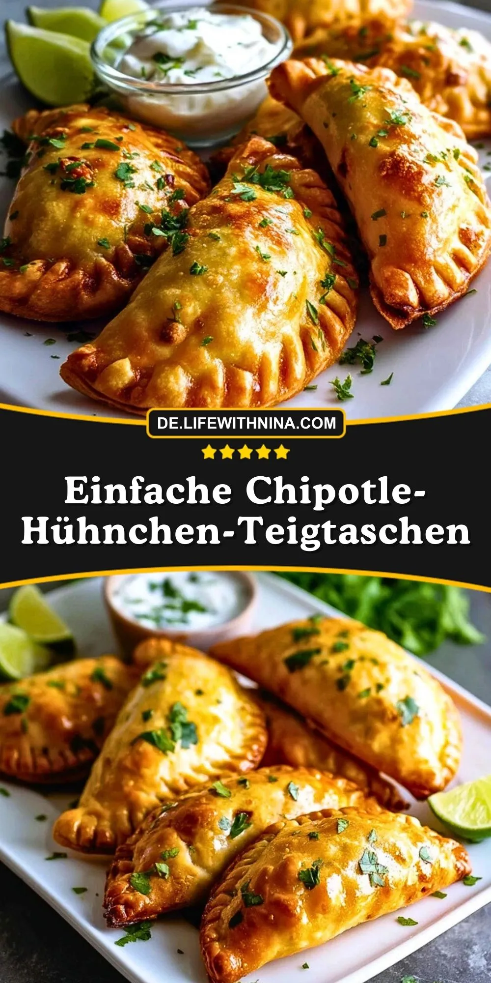 Am besten schmecken die Chipotle-Hühnchen-Teigtaschen frisch aus dem Ofen, wenn der Teig besonders knusprig und die Füllung noch schön cremig ist. Serviere sie mit Kräuterquark, Sauerrahm mit Limette, Avocado-Dip oder einer milden Salsa. Für ein vollständiges Essen passen dazu ein grüner Salat, Mais-Salat oder eine einfache Tomaten-Gurken-Beilage.