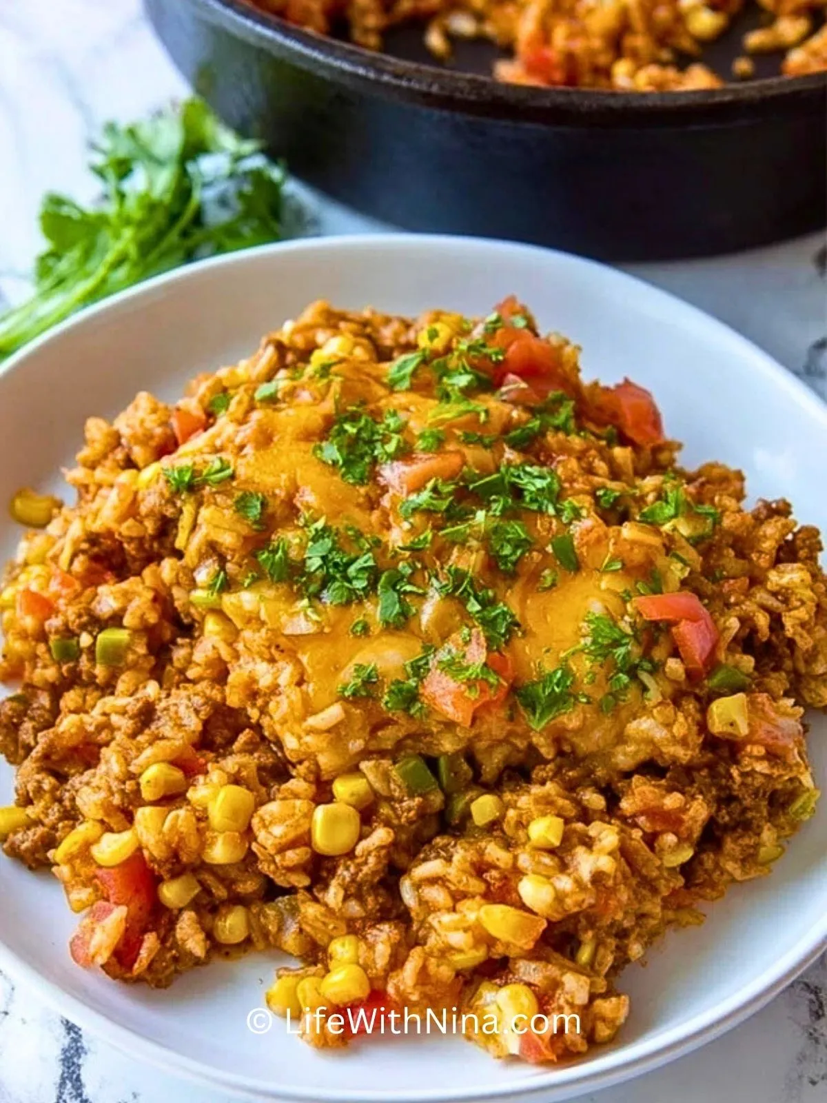 Der große Vorteil dieses Rezepts ist die schnelle und unkomplizierte Zubereitung in nur einer Pfanne. Die Kombination aus würzigem Hackfleisch, Reis, Bohnen und Mais ist unglaublich aromatisch und sorgt für ein rundum befriedigendes Gericht. Außerdem kannst du den Auflauf ganz nach deinem Geschmack abwandeln – vegetarisch, mit Hühnchen oder mit extra viel Gemüse!