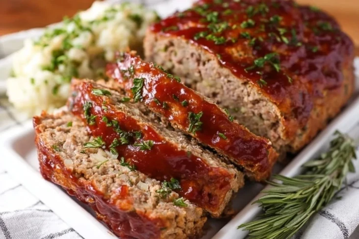 Schneide den Hackbraten in dicke Scheiben und serviere ihn heiß. Besonders gut passen Kartoffelpüree, grüne Bohnen, Ofenkartoffeln oder ein frischer Gurkensalat dazu.