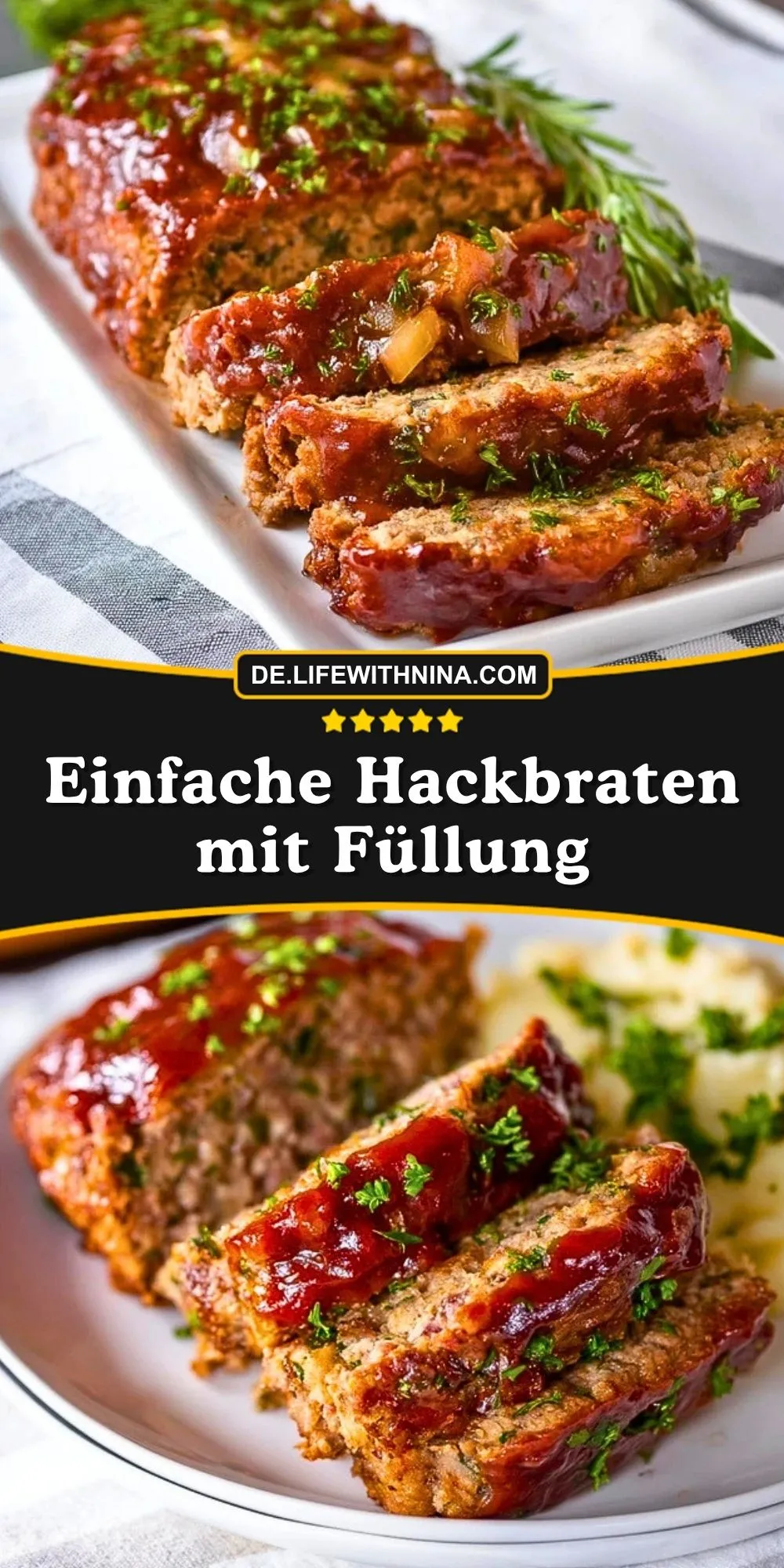Saftig, herzhaft und wunderbar alltagstauglich: Dieser einfache Hackbraten mit Füllung ist ein Ofengericht, das nach Zuhause schmeckt und gleichzeitig ein kleines Extra auf den Teller bringt. Außen bekommt der Braten eine aromatische Kruste mit würziger Glasur, innen sorgt die Füllung für Abwechslung, mehr Saftigkeit und einen besonders schönen Anschnitt.