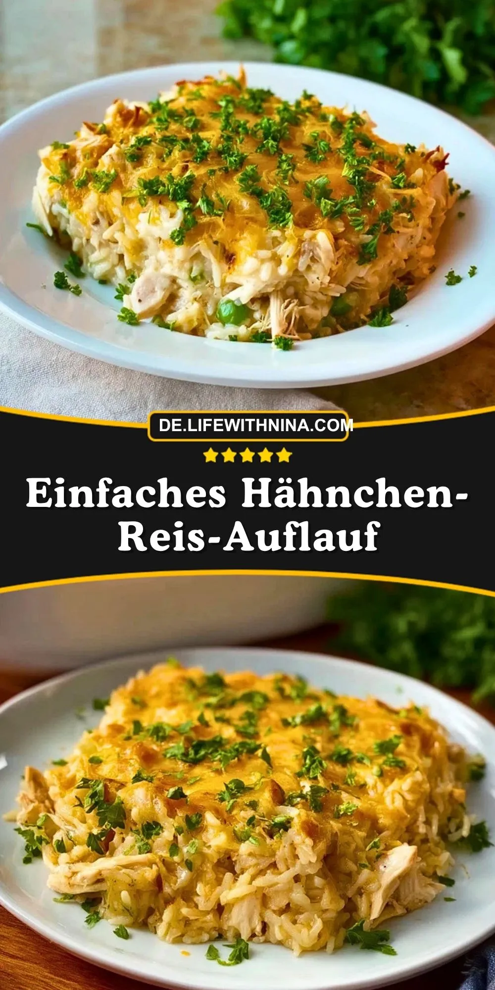 Einfacher Hähnchen-Reis-Auflauf ist ein cremiges, herzhaftes Ofengericht für die ganze Familie. Gegartes Hähnchen, lockerer Reis, Erbsen und eine würzige Frischkäse-Sahne-Sauce werden mit Käse überbacken und ergeben ein unkompliziertes Wohlfühlessen, das sich perfekt für den Alltag eignet.