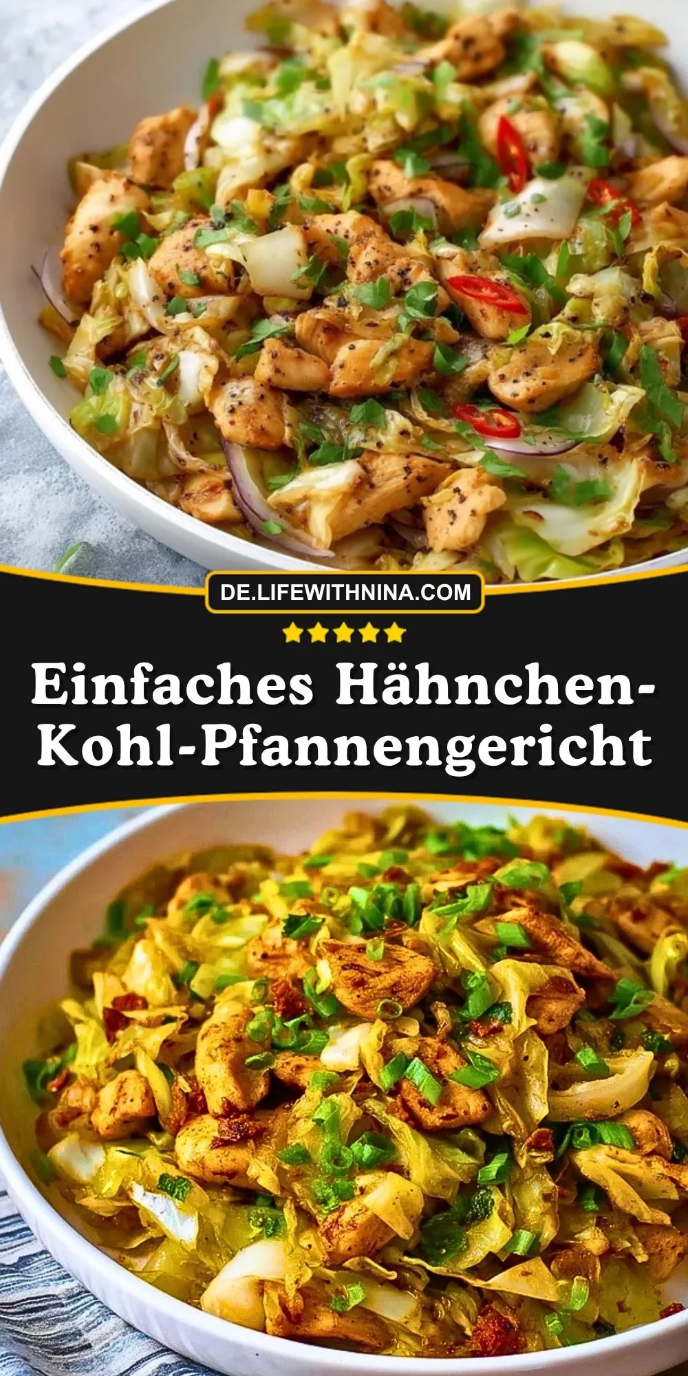 Dieses einfache Hähnchen-Kohl-Pfannengericht schmeckt frisch aus der Pfanne besonders gut. Es passt wunderbar als leichtes Hauptgericht, lässt sich aber auch mit Reis, Glasnudeln oder einem Stück knusprigem Brot ergänzen. Wer es etwas würziger mag, kann beim Servieren noch etwas Chili oder zusätzlichen Pfeffer darübergeben.