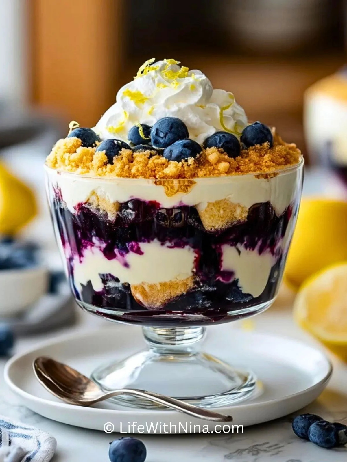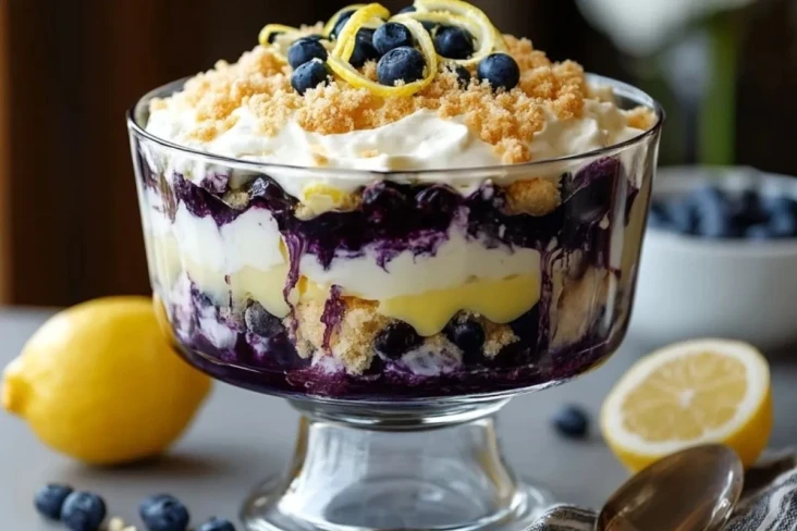 Das fertige Trifle mit frischen Heidelbeeren, Zitronenzesten und Keksstreuseln garnieren. Mindestens 2 Stunden (oder über Nacht) im Kühlschrank durchziehen lassen, damit sich die Aromen verbinden und die Kekse leicht weich werden.