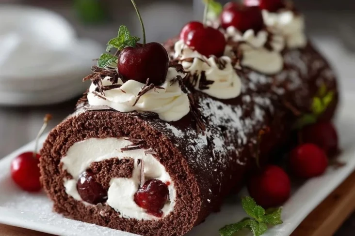 Bestäube die Rolle mit Puderzucker, garniere sie mit Sahnetuffs, Schokoraspeln, frischen Kirschen und etwas Minze.