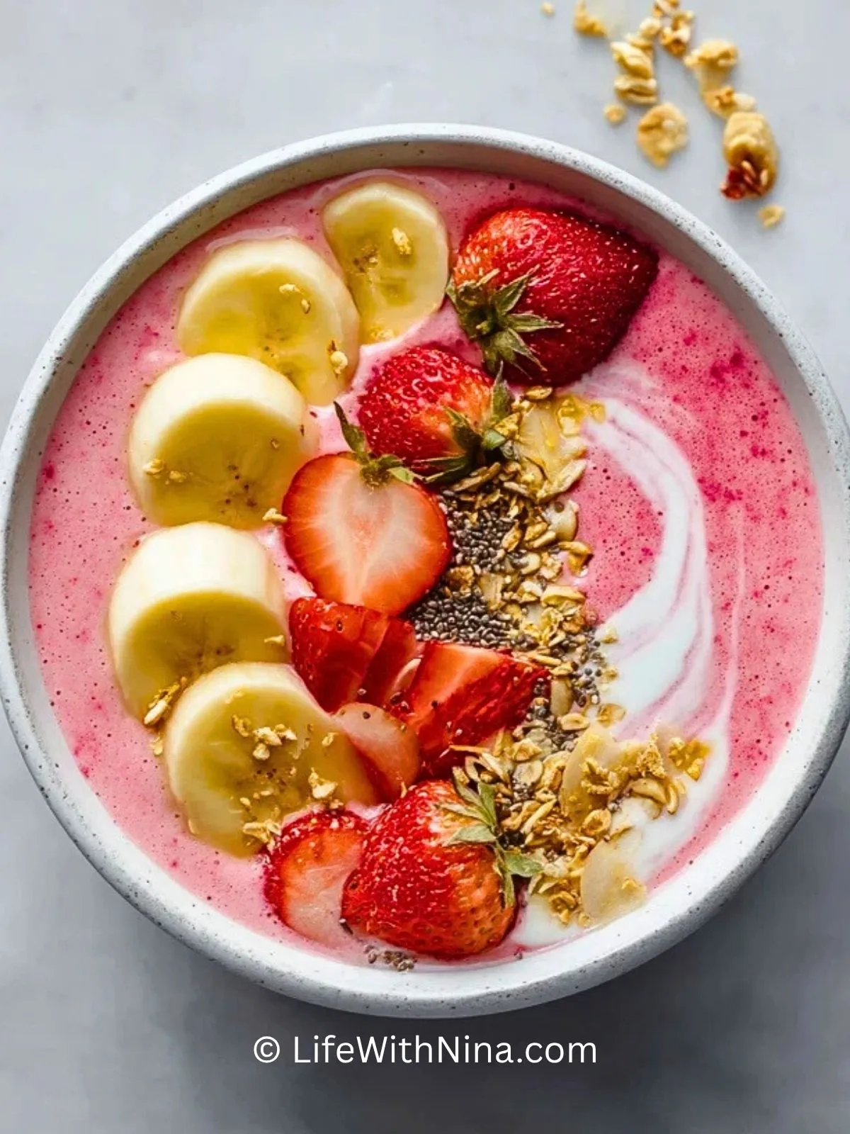 Diese Erdbeer-Bananen-Smoothie-Bowl ist die perfekte Mischung aus cremig, fruchtig und erfrischend. Reife Bananen sorgen für eine natürliche Süße, während Erdbeeren der Bowl ihre leuchtende Farbe und ein herrlich sommerliches Aroma verleihen. Das Ergebnis ist ein Frühstück oder Snack, der nicht nur sättigt, sondern auch richtig schön aussieht.