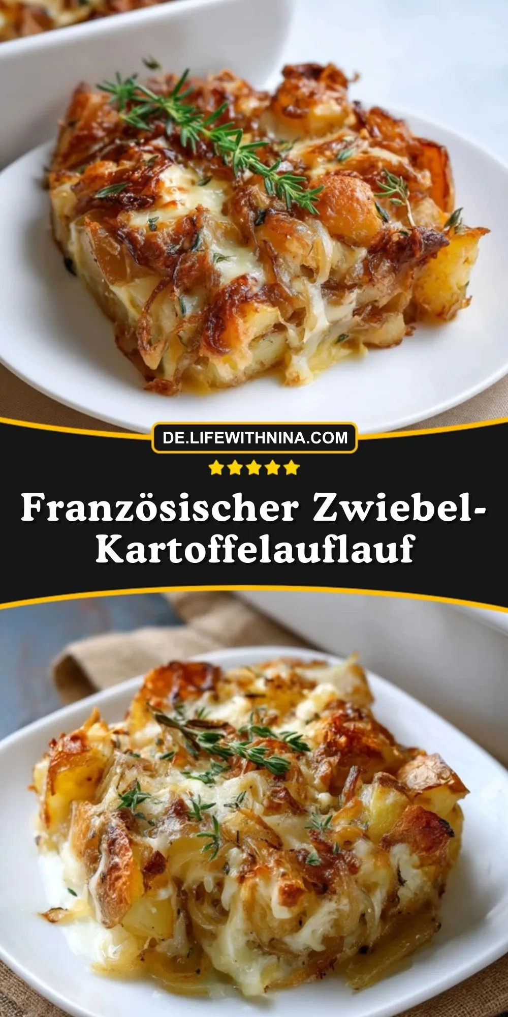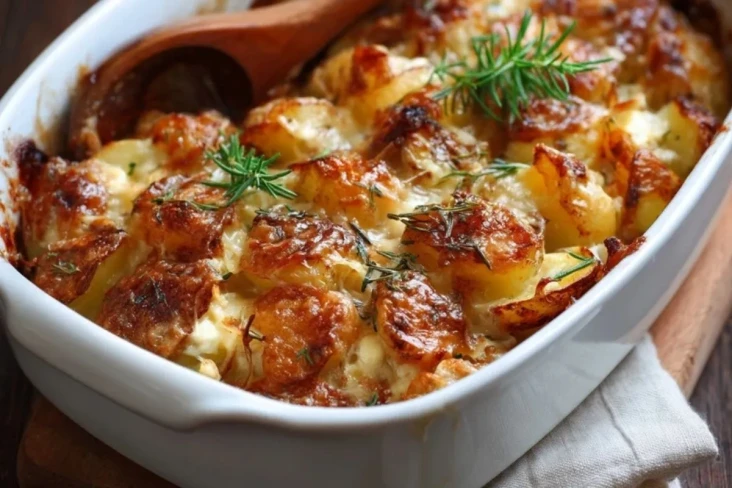 Cremiger französischer Kartoffelauflauf mit karamellisierten Zwiebeln, frischen Kräutern und goldbrauner Käseschicht. Perfekt als Hauptgericht oder Beilage – typisch französisch, herzhaft und wunderbar aromatisch!