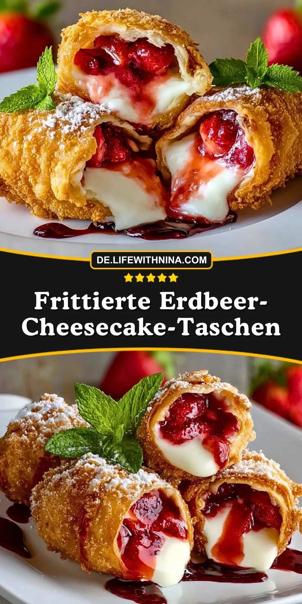 Das Besondere an diesem Rezept ist das Spiel aus Texturen und Temperaturen. Die Hülle wird beim Frittieren knusprig und leicht karamellisiert, während die Füllung weich, cremig und fruchtig bleibt. Erdbeeren bringen Frische und leichte Säure mit, die perfekt zu der milden Frischkäsecreme passt. Genau dieser Kontrast macht die Taschen zu einem Dessert, das gleichzeitig gemütlich, raffiniert und absolut genussvoll wirkt.