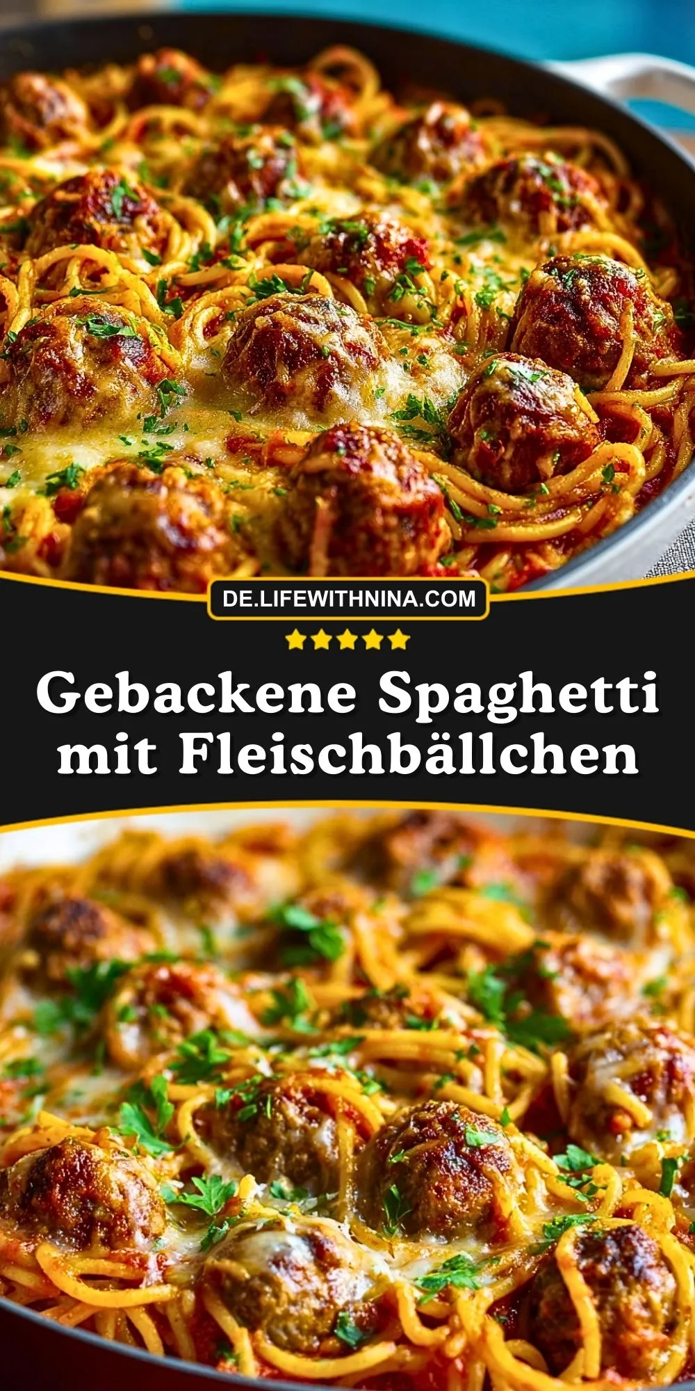 Die gebackenen Spaghetti mit Fleischbällchen sind besonders praktisch, weil sie sich hervorragend vorbereiten lassen und im Ofen ganz ohne Stress fertig garen. Während der Duft von Kräutern, geschmolzenem Käse und würziger Sauce durch die Küche zieht, bleibt genug Zeit, den Tisch zu decken oder einen knackigen Salat zuzubereiten. Ein Gericht, das garantiert alle satt und glücklich macht!