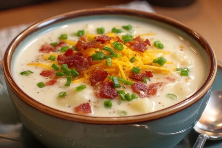 Verteile die heiße Suppe auf Schalen und bestreue sie mit zerbröseltem Bacon, zusätzlichem Käse und fein geschnittenen Frühlingszwiebeln. Direkt servieren, solange die Suppe besonders cremig und heiß ist.