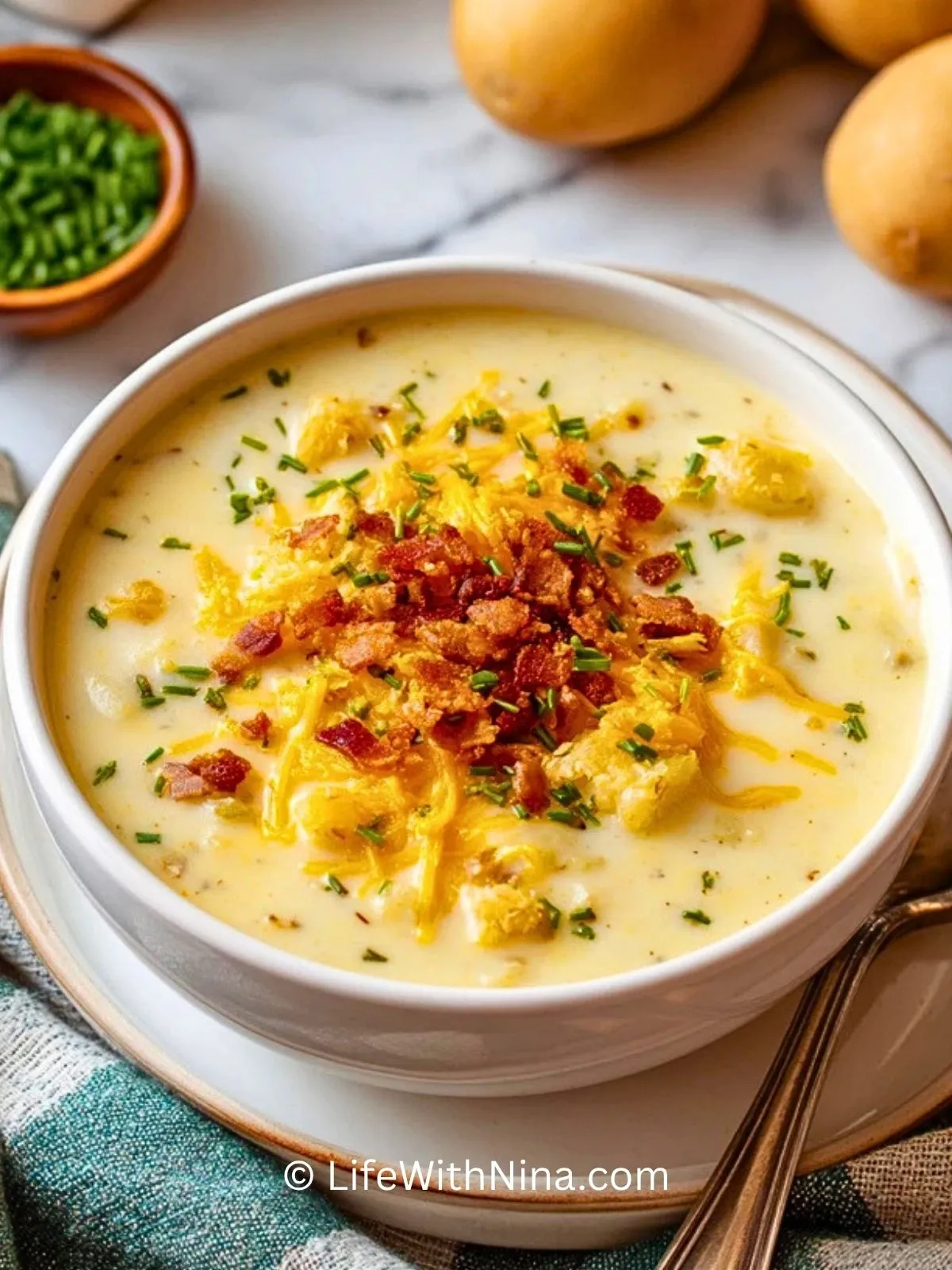 Besonders praktisch ist dieses Rezept an kühlen Tagen oder dann, wenn es in der Küche schnell gehen soll. Die Suppe wird samtig und sättigend, während knuspriger Bacon, würziger Käse und frische Frühlingszwiebeln als Topping für den klassischen Ofenkartoffel-Geschmack sorgen. So entsteht ein einfaches Wohlfühlessen, das alltagstauglich ist und trotzdem nach etwas Besonderem schmeckt.