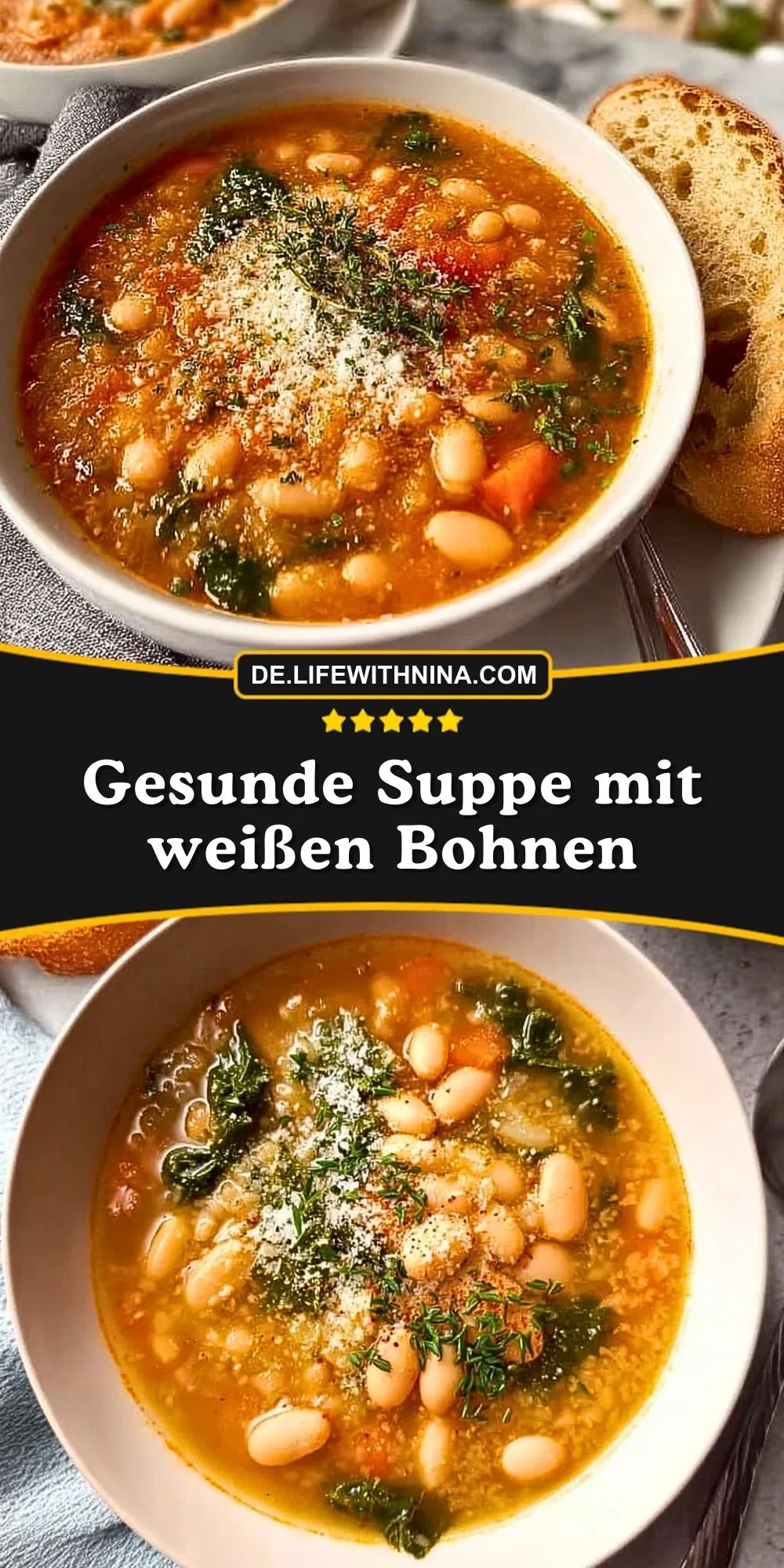 Diese Suppe mit weißen Bohnen ist herrlich cremig, sättigend und dabei wunderbar leicht. Ideal für kalte Tage oder wenn du dir eine gesunde Mahlzeit mit viel Gemüse, Protein und Ballaststoffen wünschst. Mediterrane Kräuter und ein Hauch Parmesan sorgen für echtes Wohlfühlessen – schnell gemacht und für jeden Tag!