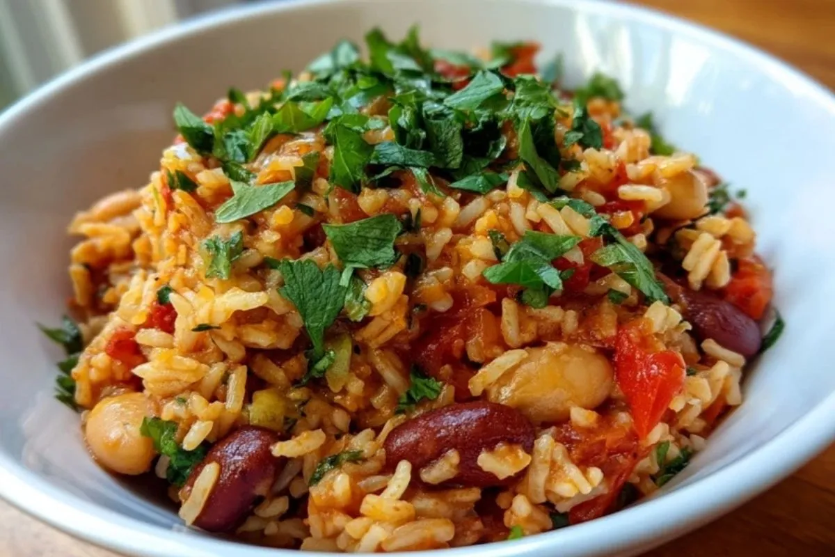 Reispfanne mit Paprika und Erbsen für eine sättigende Familienmahlzeit.
