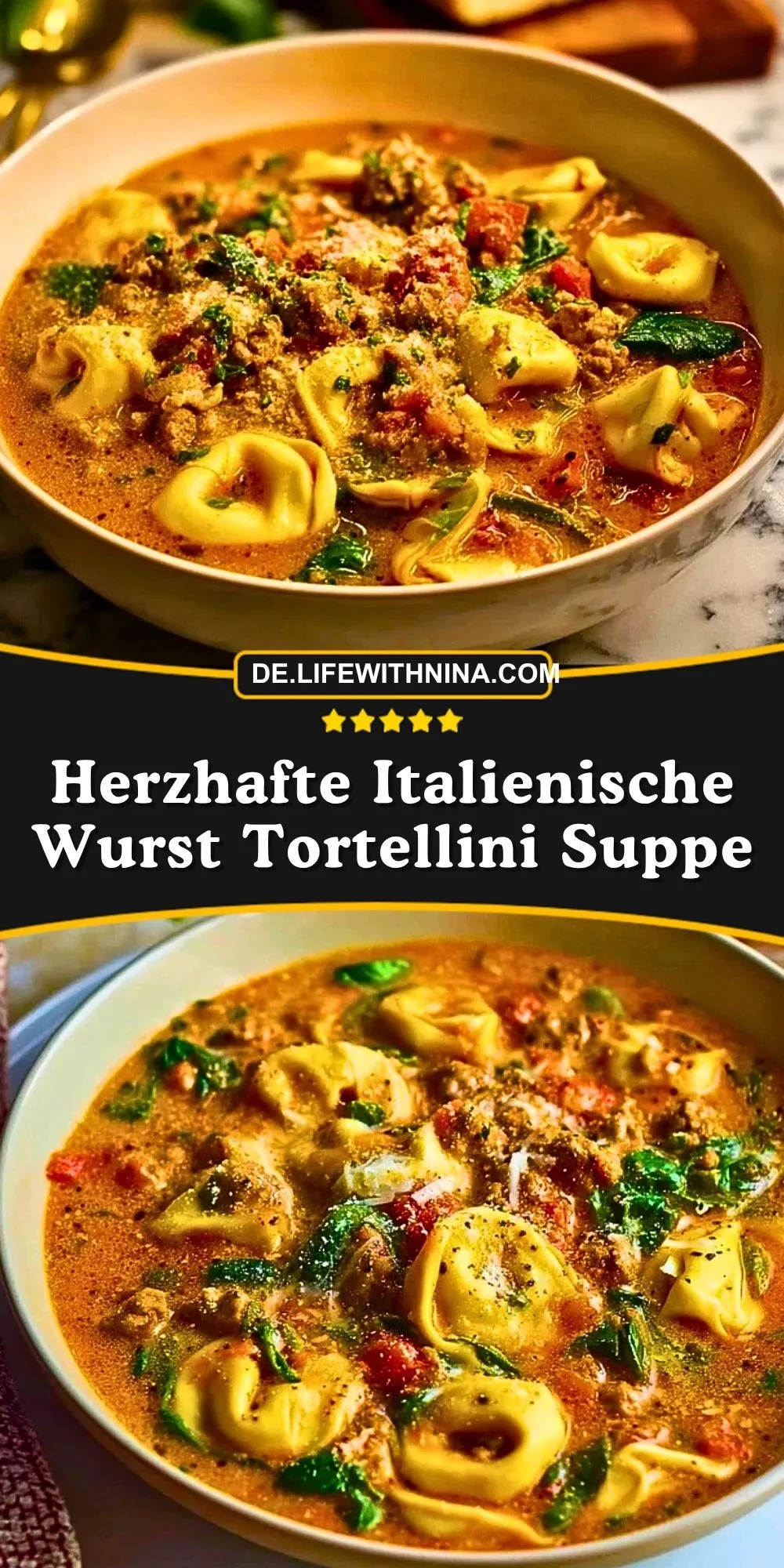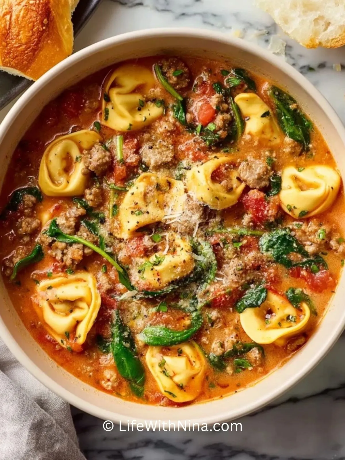 Eine herzhafte, wärmende Suppe mit würziger italienischer Wurst, zarten Tortellini, Tomaten, Spinat und Parmesan. Perfekt für ein gemütliches Abendessen und schnell genug für den Alltag.