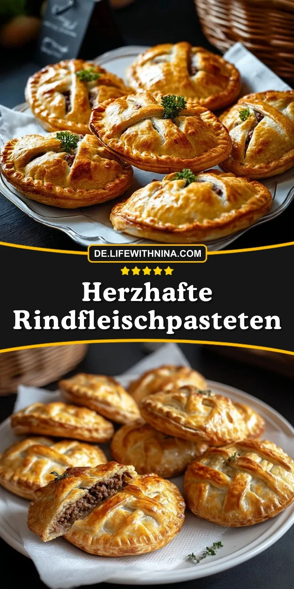 Diese herzhaften Rindfleischpasteten bestehen aus knusprigem Blätterteig und einer saftigen Hackfleischfüllung mit Gemüse, Kräutern und einer aromatischen Sauce – perfekt als Hauptgericht, fürs Partybuffet oder für ein gemütliches Abendessen aus der Hand.