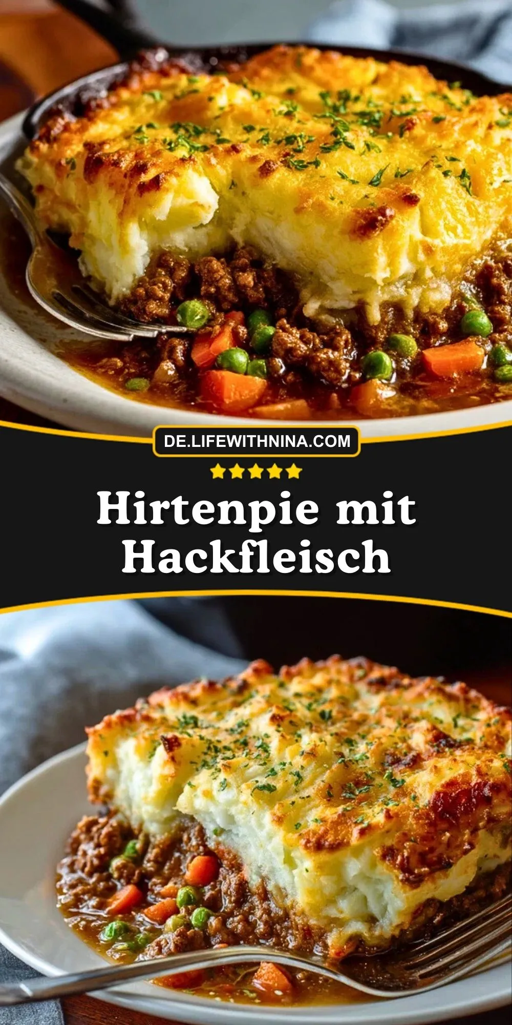 Hirtenpie mit Hackfleisch ist ein herzhafter Klassiker aus der britischen Küche, der auch in Deutschland viele Fans gefunden hat. Unter einer goldbraun gebackenen Kartoffelpüree-Haube verbirgt sich eine würzige Hackfleischfüllung mit Erbsen, Möhren und einer kräftigen Sauce. Dieses Gericht ist perfekt für gemütliche Abende und wärmt von innen, wenn es draußen ungemütlich wird.