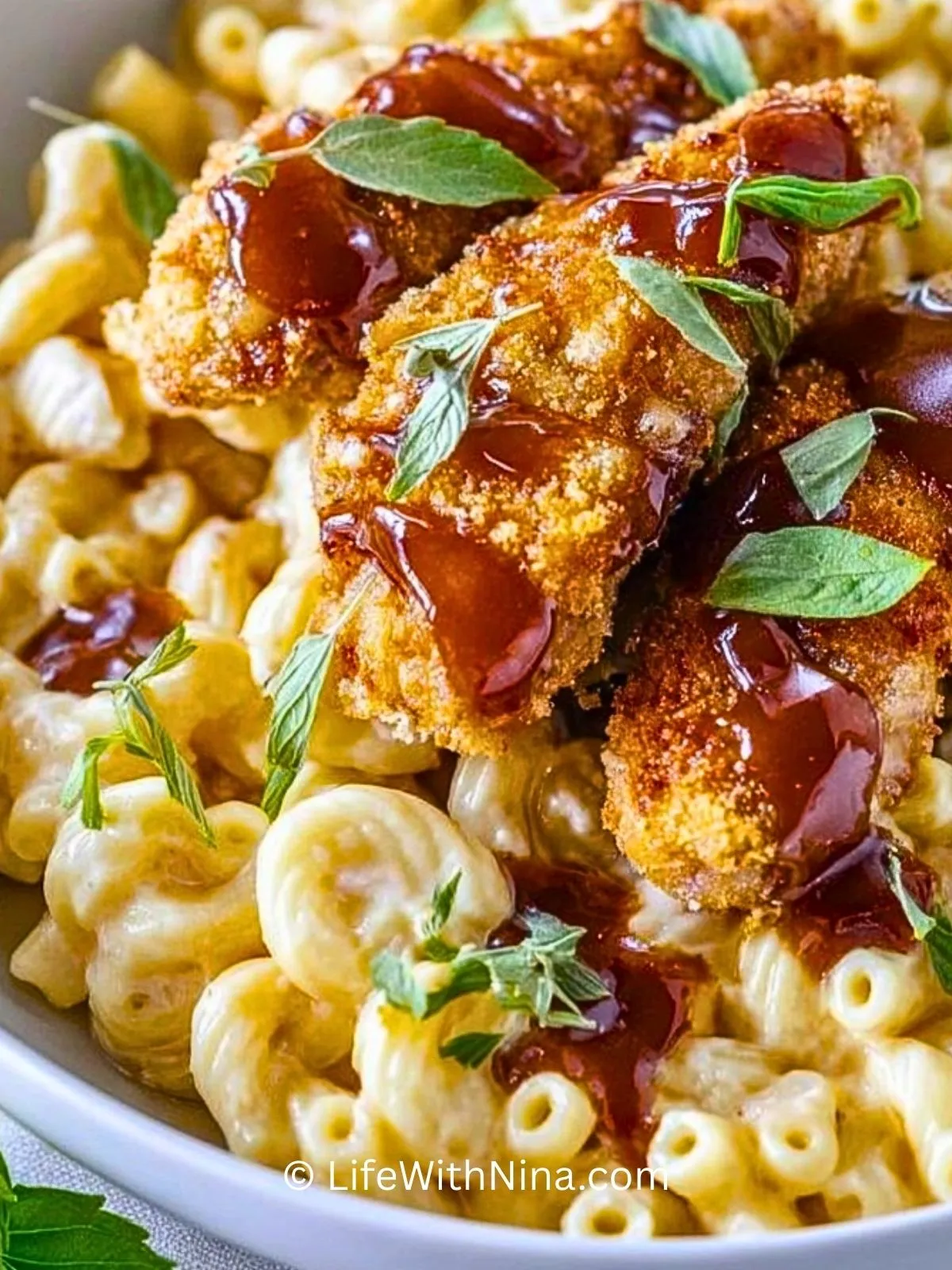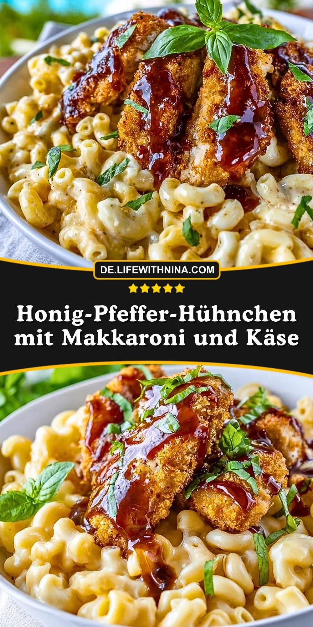 Knusprig paniertes Hähnchen mit einer süßen Honig-Pfeffer-Sauce, serviert auf cremigen Makkaroni und Käse – ein Wohlfühlgericht mit besonderem Twist. Perfekt für Familie, Gäste oder einfach einen gemütlichen Abend!