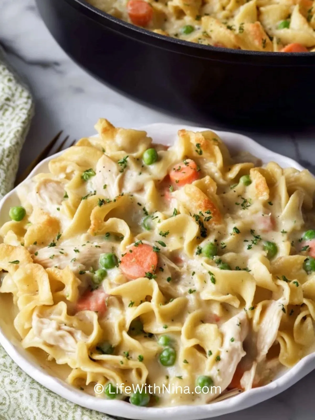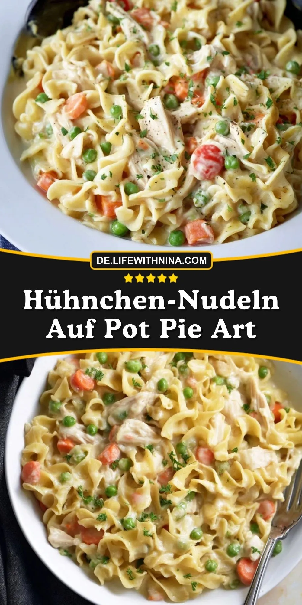 Cremige Hühnchen-Nudeln Auf Pot Pie Art vereinen zartes Hähnchenfleisch, saftiges Gemüse und breite Eiernudeln in einer sämigen Sauce – das perfekte Wohlfühlgericht für die ganze Familie.