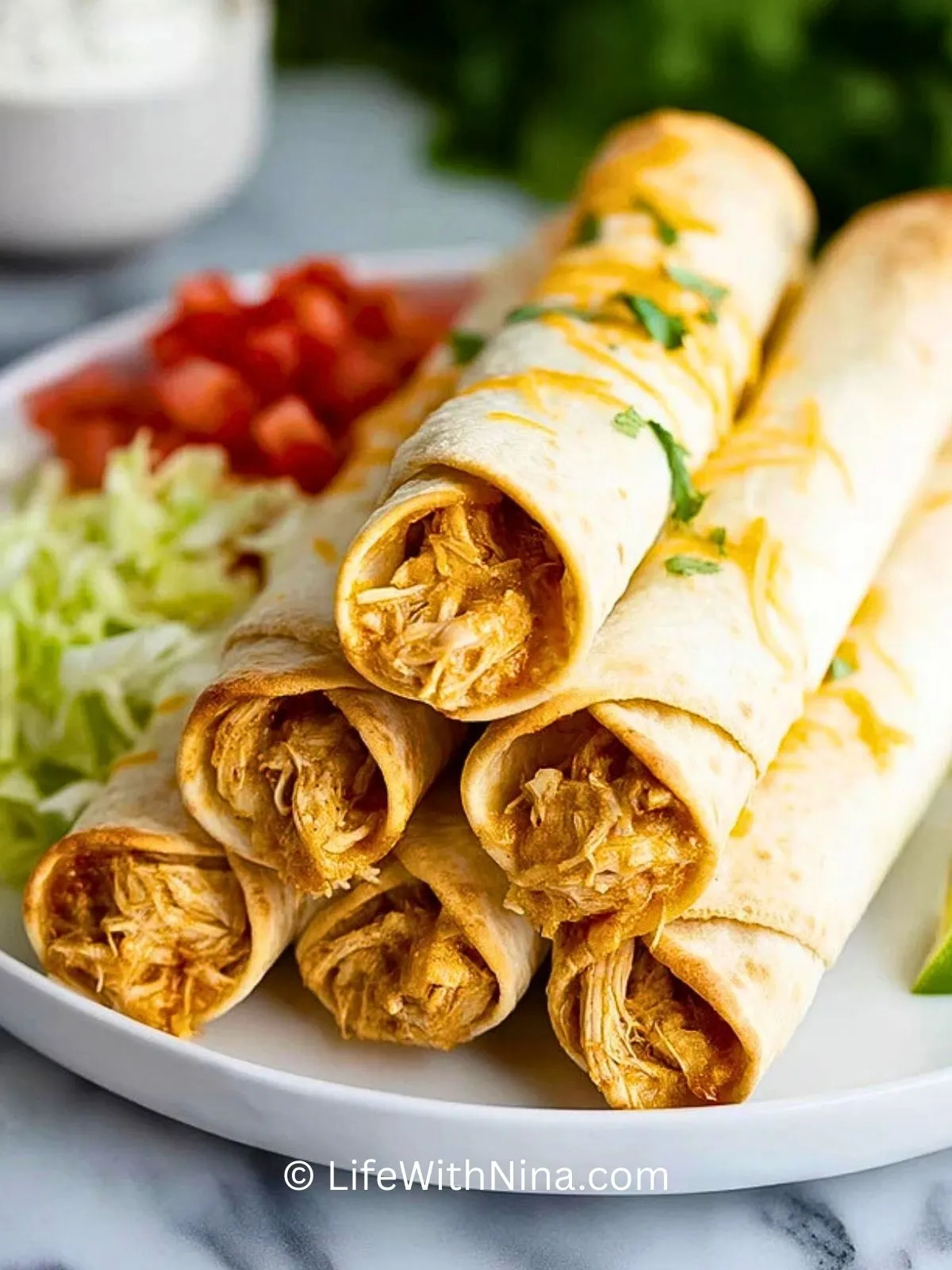Am besten schmecken die Hühnchen Taquitos direkt aus dem Ofen, wenn sie außen schön knusprig und innen noch richtig cremig sind. Richte sie auf einer großen Platte an, garniere sie mit frischen Toppings und stelle verschiedene Dips in kleinen Schälchen dazu – so kann sich jeder nach Lust und Laune bedienen.