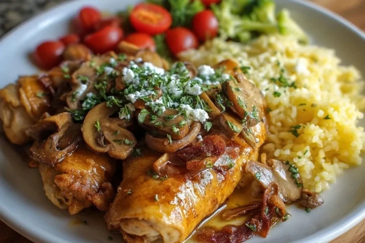 Dieses Hühnchenreste-Gericht mit Pilzen und Reis verwandelt übrig gebliebenes Hähnchen in eine cremige Pfannensauce mit Champignons, Speck und Kräutern, die zusammen mit lockerem Reis im Handumdrehen zu einem gemütlichen Familienessen wird.
