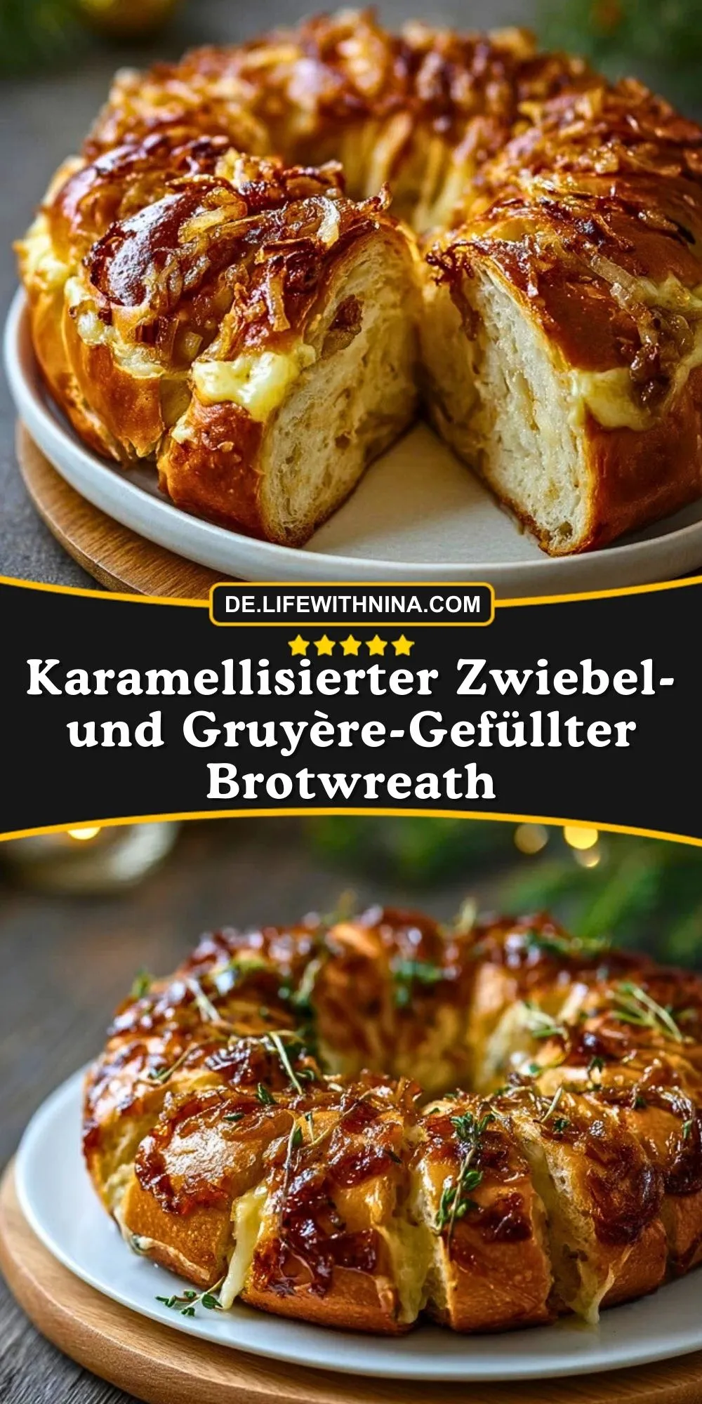 Dieser Brotwreath mit karamellisierten Zwiebeln und würzigem Gruyère ist außen knusprig, innen fluffig und das perfekte Party- oder Brunchbrot! Das Aroma von geschmolzenem Käse, süßlichen Zwiebeln und frischen Kräutern macht es zum Highlight jeder Tafel.