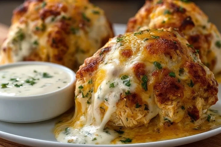 Käse-Ranch-Hühnchen-Bomben schmecken am besten frisch aus dem Ofen mit einem cremigen Dip, einem knackigen Salat oder Ofengemüse. Auch Kartoffelspalten oder ein leichter Krautsalat passen sehr gut dazu, weil sie einen angenehmen Kontrast zur reichhaltigen Füllung bilden.