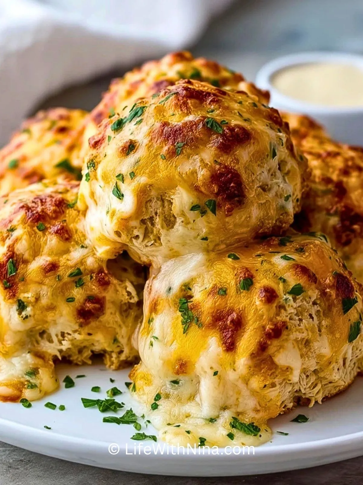 Würzige Knoblauch-Hähnchen-Bällchen mit Dip für alle, die es deftig und saftig mögen.