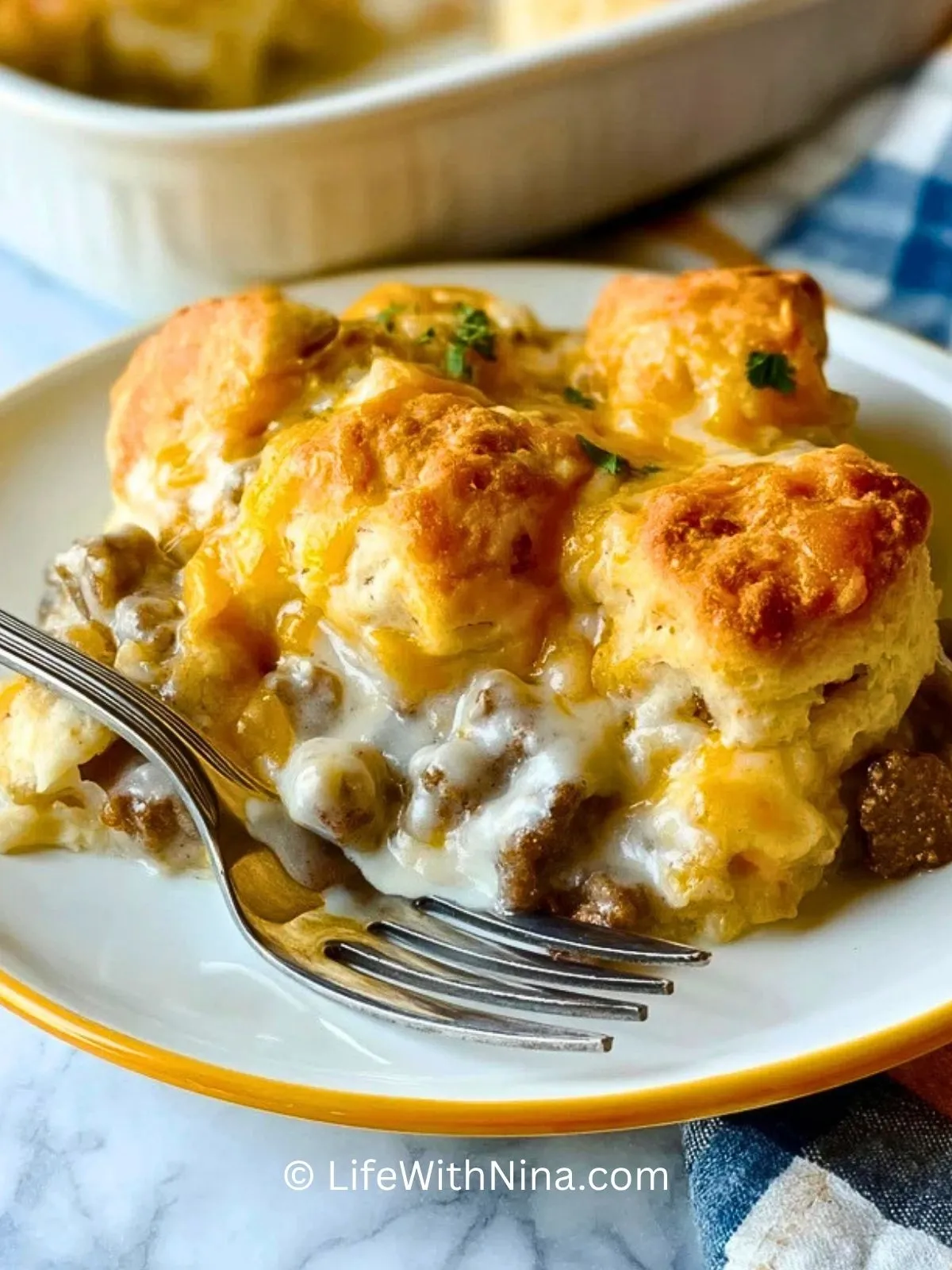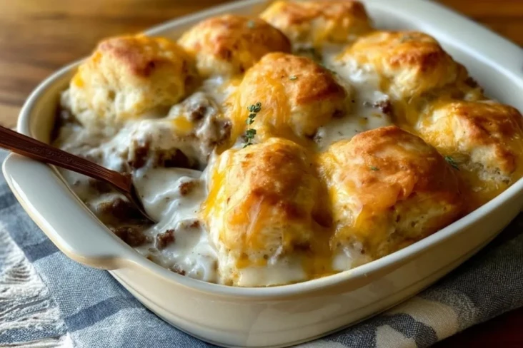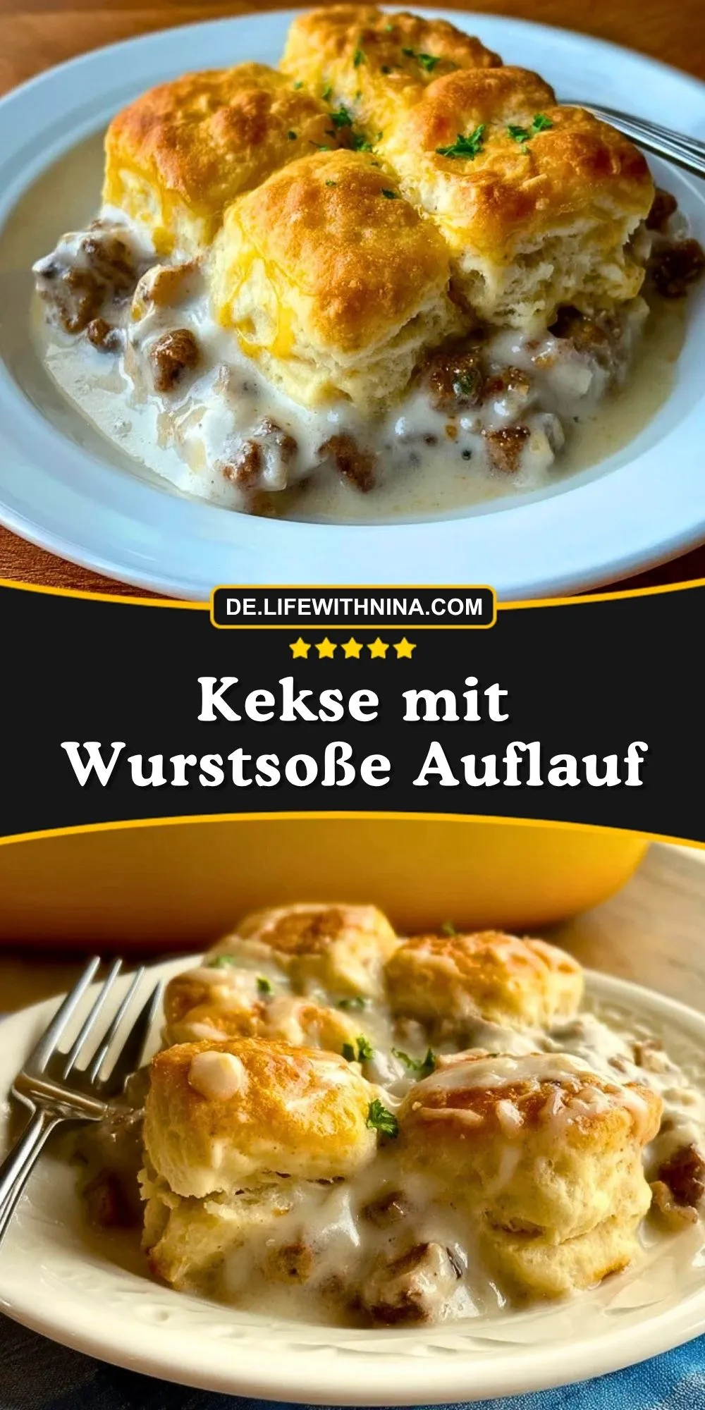 Kekse mit Wurstsoße Auflauf ist ein herzhaftes, cremiges Ofengericht mit würziger Wurst, geschmolzenem Käse und goldbraun gebackenen Keksen. Dieses Rezept eignet sich wunderbar für ein gemütliches Frühstück, einen Brunch mit Gästen oder ein schnelles, sättigendes Abendessen.