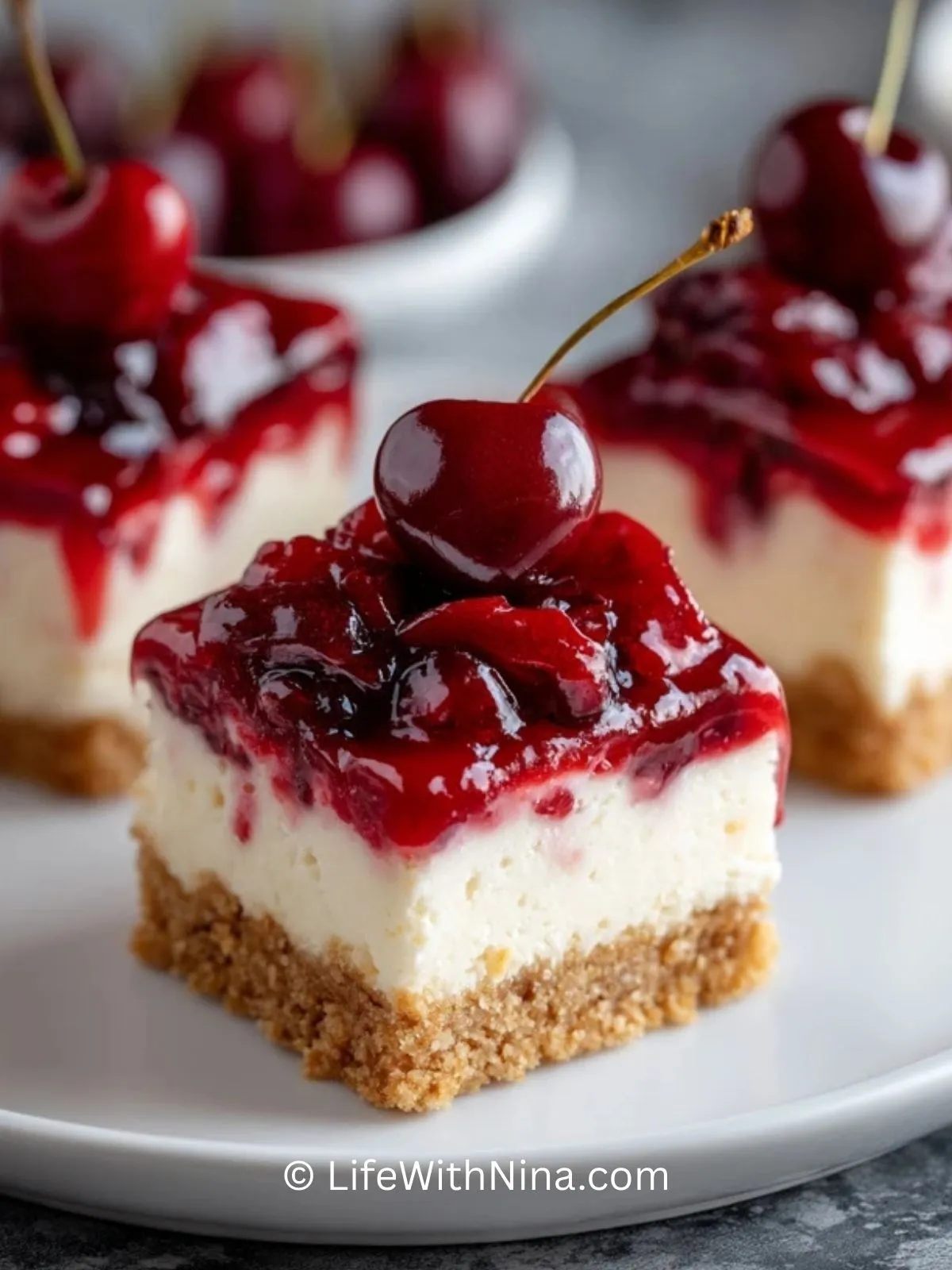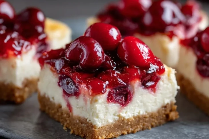 Saftig-cremige Kirschenkäsekuchen Riegel auf einem knusprigen Keksboden, getoppt mit fruchtigen Sauerkirschen. Perfekt vorzubereiten, unwiderstehlich lecker und ideal zum Teilen.
