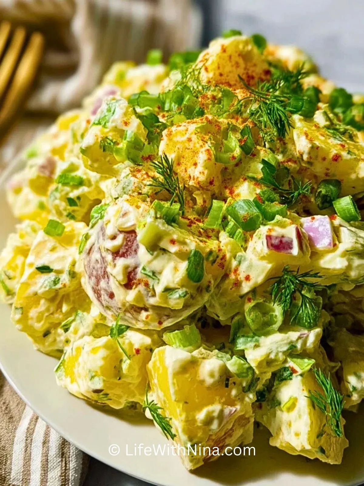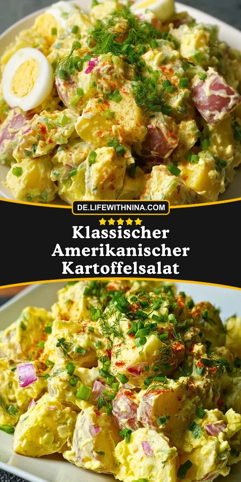 Ein cremiger, würziger Kartoffelsalat nach amerikanischer Art mit Mayonnaise, Senf, Eiern und knackigem Gemüse. Perfekt als Beilage zum Grillen oder für Buffets.