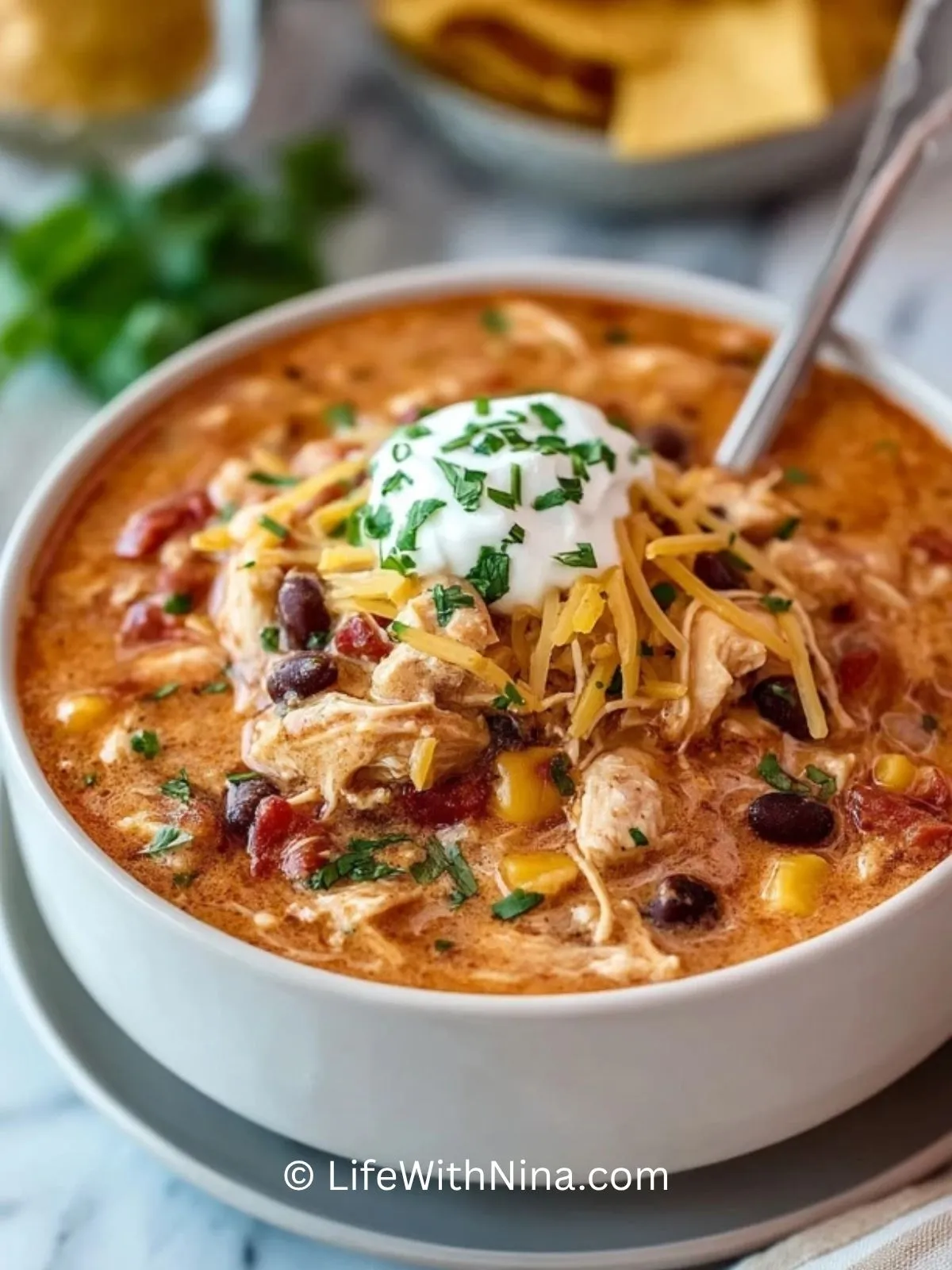 Besonders praktisch ist, dass sich dieses Rezept fast von selbst kocht. Während der Slow Cooker arbeitet, entwickeln die Zutaten nach und nach ihr volles Aroma. Am Ende entsteht ein sämiges Chili mit saftigem Hähnchen und einer leicht käsigen, cremigen Konsistenz, das mit Toppings wie geriebenem Käse, Sauerrahm und frischen Kräutern noch besser wird.