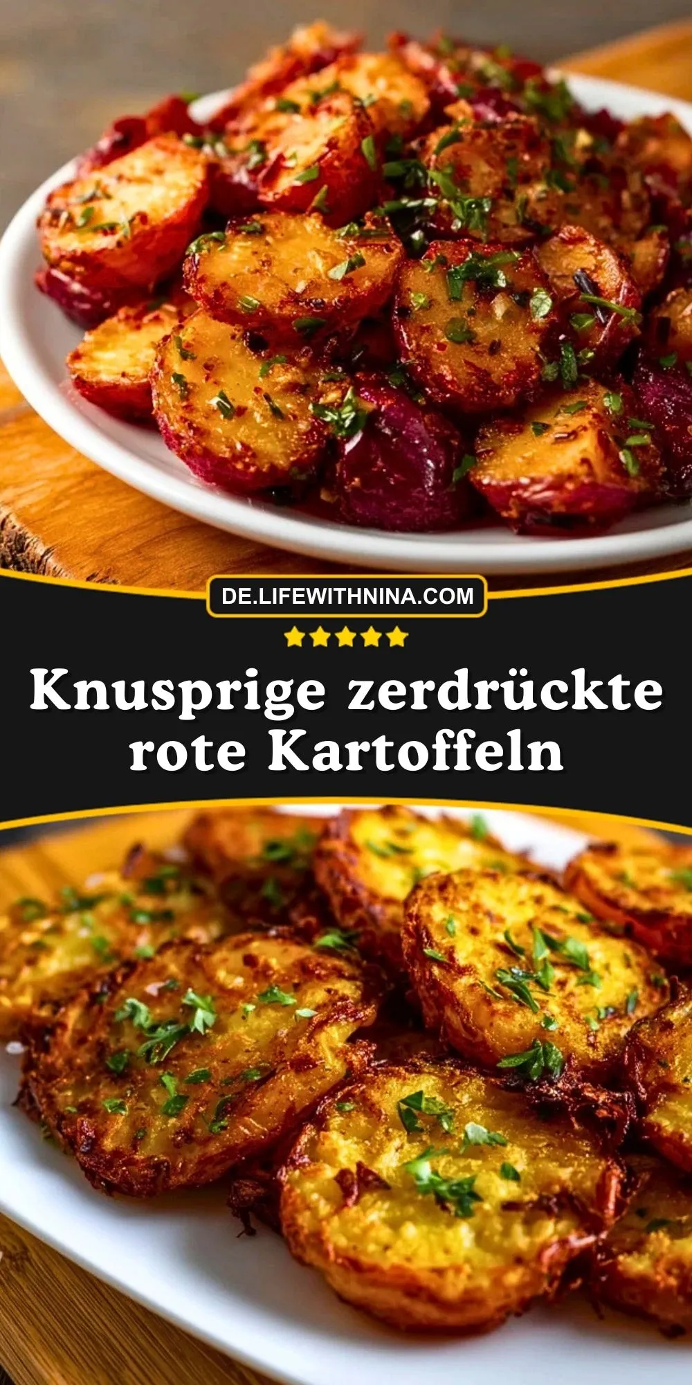 Knusprige zerdrückte rote Kartoffeln begeistern mit goldbrauner Kruste, zartem Inneren und frischen Kräutern – perfekt als Beilage, Snack oder fürs Buffet. Sie verbinden deutsche Kartoffeltradition mit modernem Twist und gelingen garantiert!