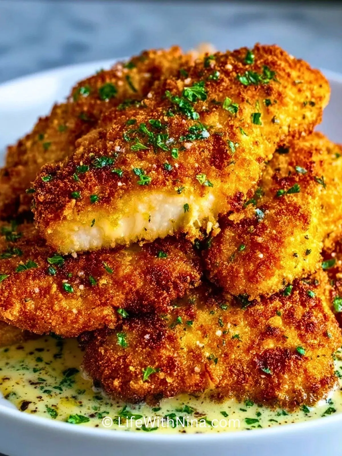 Verwende am besten Panko-Paniermehl und brate das Hähnchen bei mittlerer bis hoher Hitze in ausreichend Öl oder Butterschmalz.