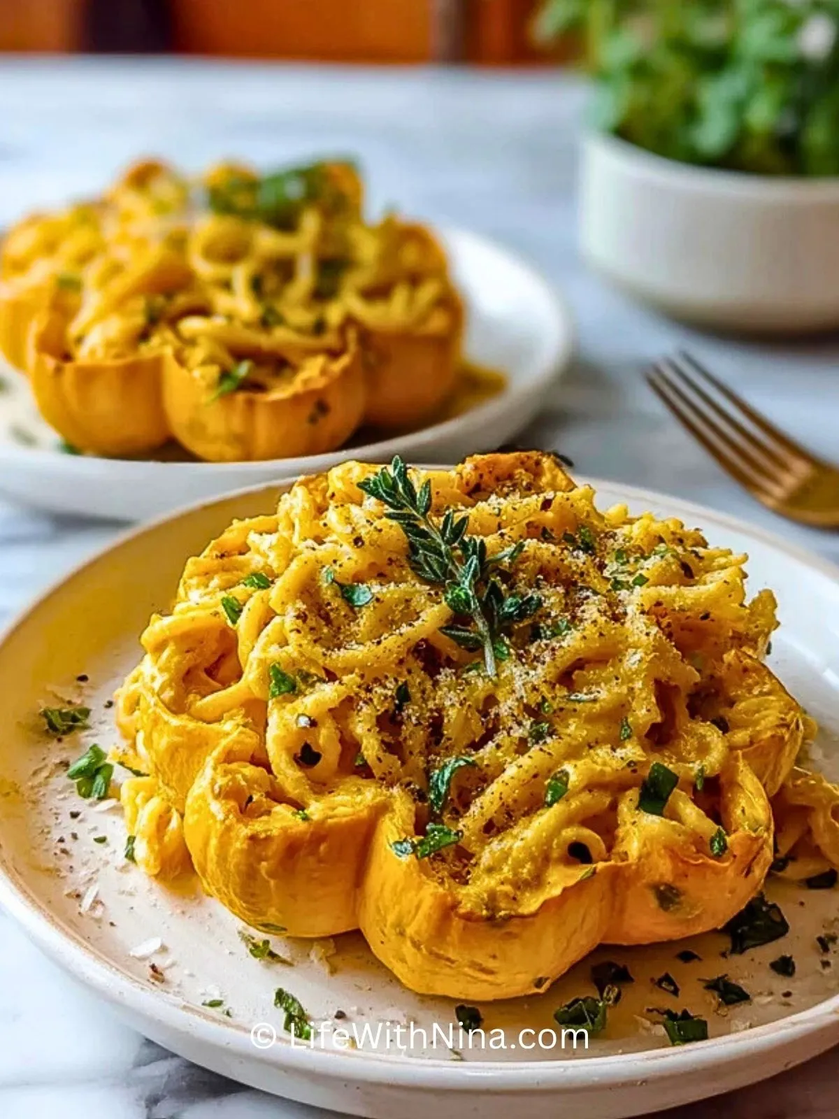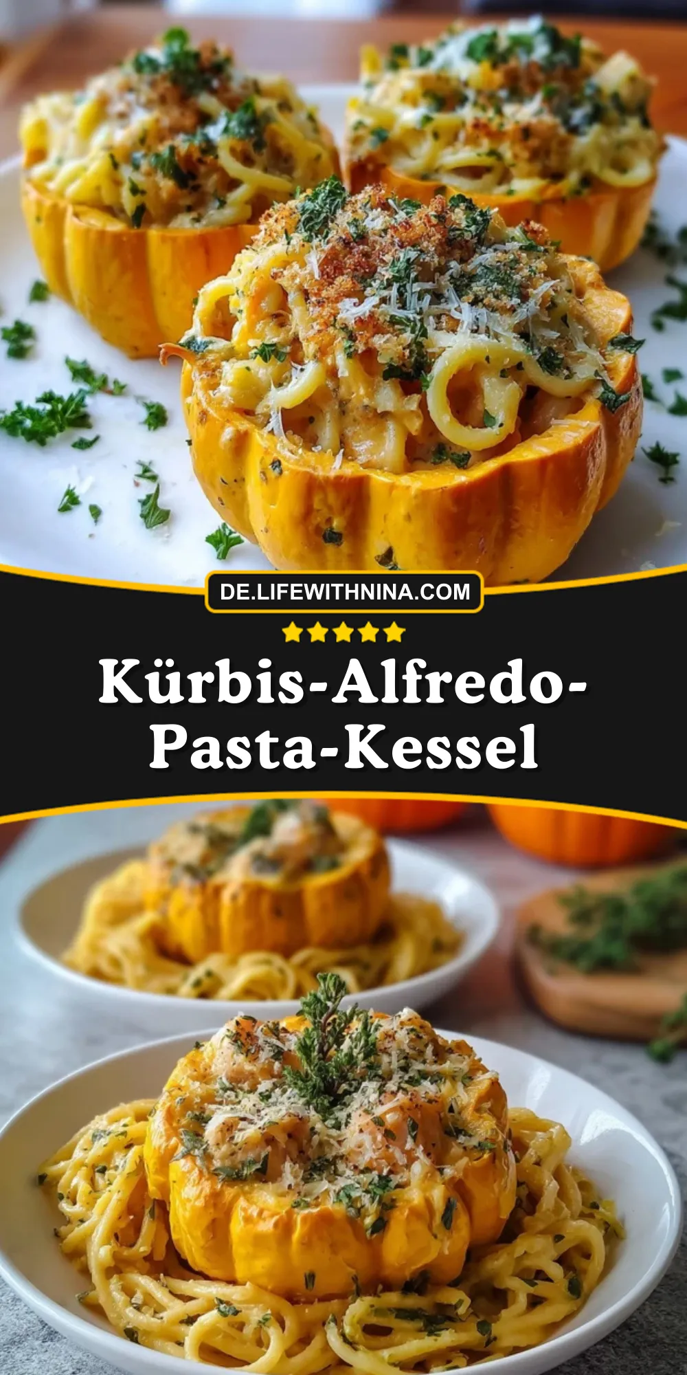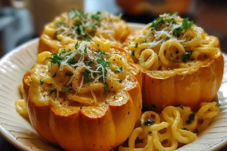 Der Kürbis-Alfredo-Pasta-Kessel vereint cremige Wohlfühlküche mit herbstlichem Aroma. Zarter Ofenkürbis wird zu einer essbaren Schale, gefüllt mit samtiger Pasta in einer reichhaltigen Alfredo-Sauce – ein Gericht, das optisch beeindruckt und geschmacklich überzeugt.