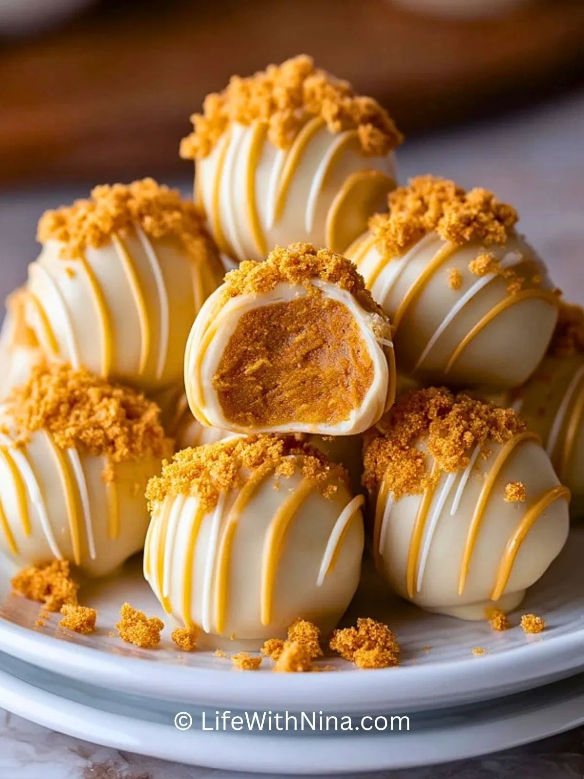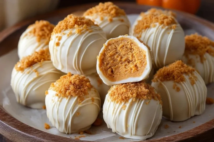 Cremige Kürbis-Pie Cheesecake Pralinen mit Frischkäse, feinen Butterkeksbröseln und einer zarten Hülle aus weißer Schokolade sind ein kleines Herbstdessert mit großer Wirkung. Sie schmecken würzig, sahnig und angenehm süß und eignen sich perfekt zum Verschenken, für Kaffeerunden oder als hübscher Hingucker auf dem Desserttisch.