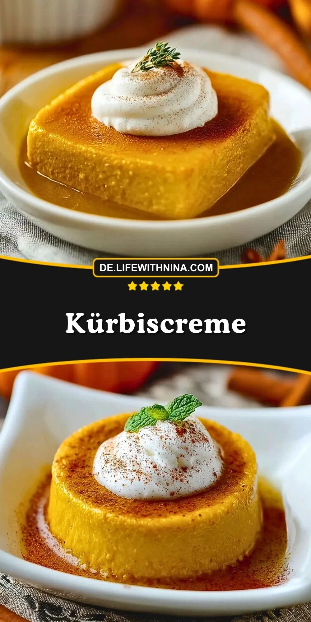 Die Creme wird schonend im Ofen gebacken und erinnert im Geschmack an Kürbiskuchen, nur luftiger und löffelweicher. Mit einem Klecks Schlagsahne und knusprigen Kürbiskernen serviert, sieht sie außerdem richtig edel aus – perfekt, wenn du Gäste beeindrucken möchtest, ohne stundenlang in der Küche zu stehen.