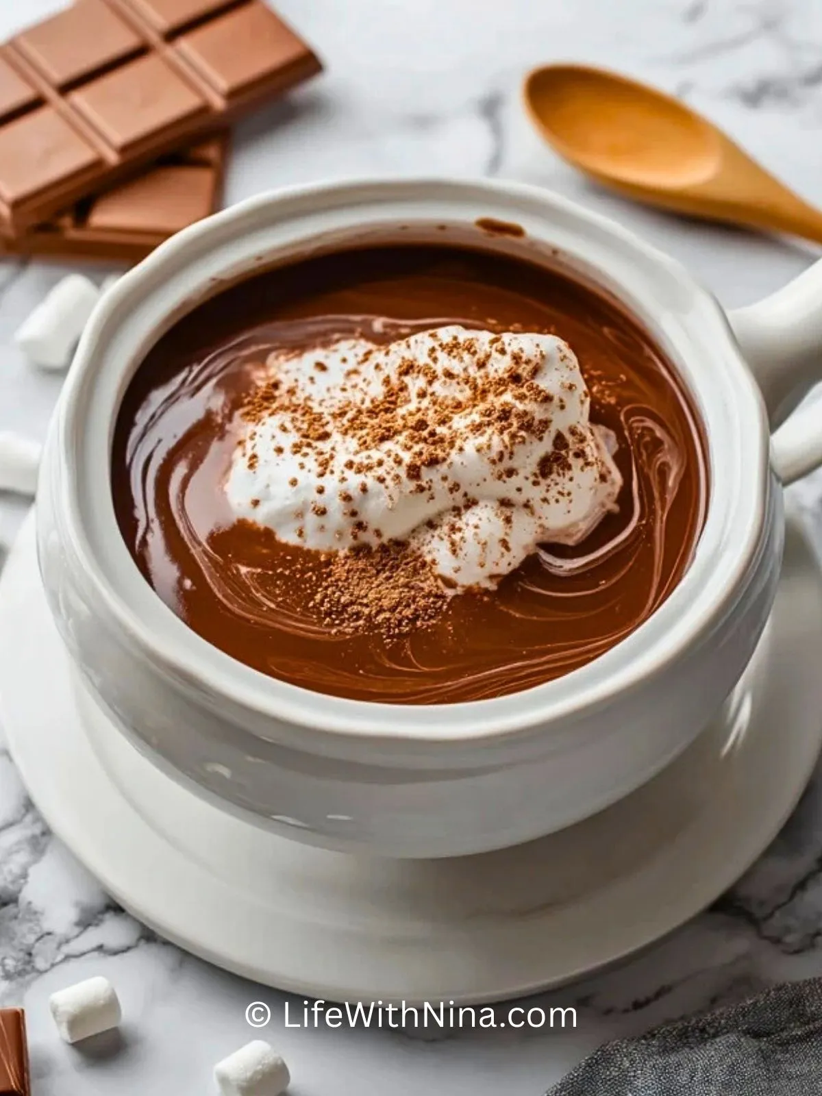Diese langsam zubereitete Schokoladen-Trinkschokolade ist besonders cremig, aromatisch und ein echtes Wohlfühlgetränk für kalte Tage. Die Kombination aus hochwertiger Schokolade, Milch und Sahne sorgt für eine luxuriöse Konsistenz, die durch langsames Ziehenlassen perfekt wird. Ideal mit Marshmallows oder Sahne!