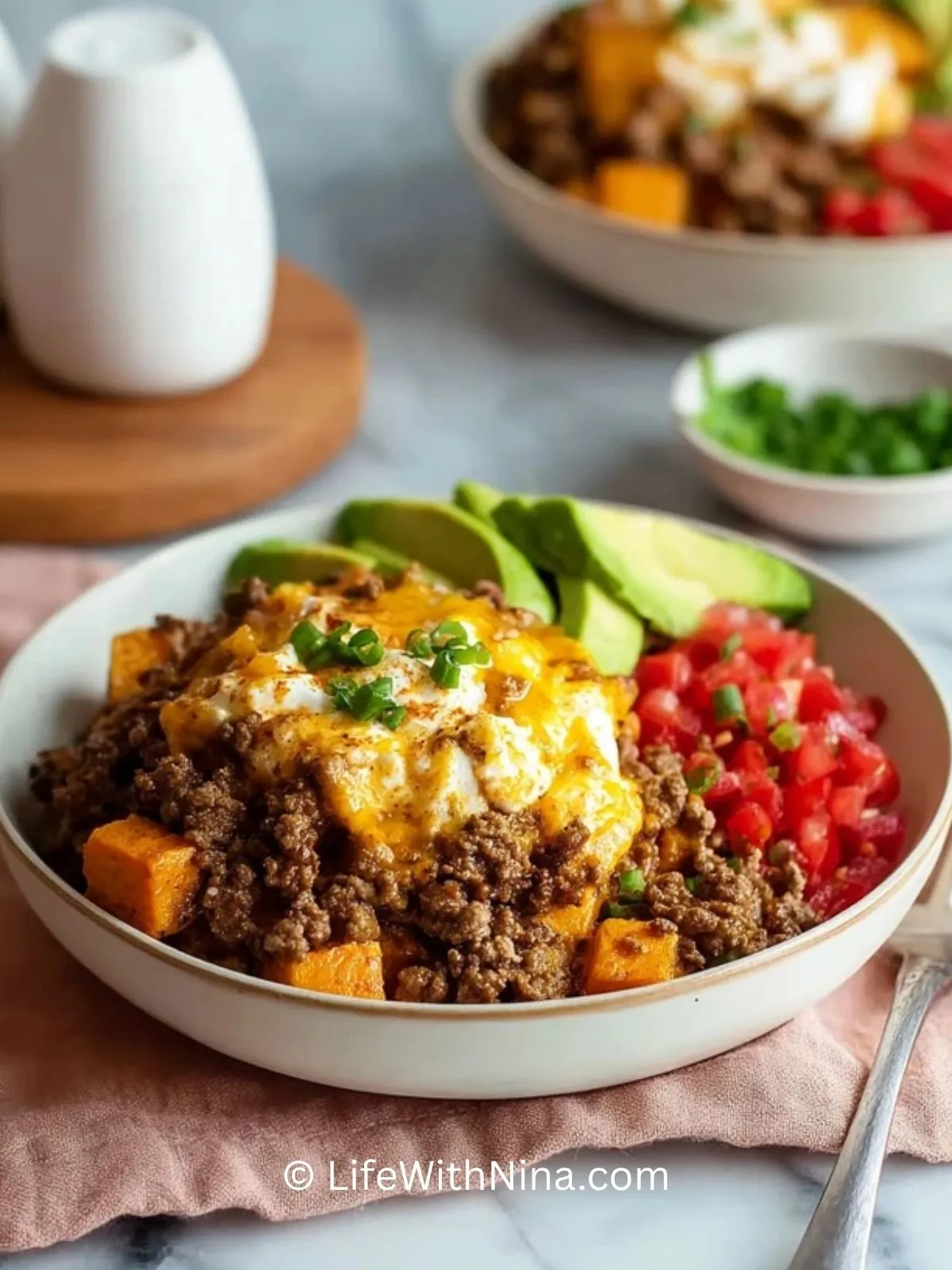 Weil sie cremige, frische und herzhafte Elemente in einer einzigen Schüssel vereinen. Das Hackfleisch sorgt für würzige Tiefe, der Quark bringt eine milde Frische mit, und Gemüse wie Brokkoli, Tomaten, rote Zwiebel, Avocado und Ofengemüse liefern Farbe, Struktur und zusätzlichen Geschmack. Dadurch entsteht ein Gericht, das sättigt, aber nicht schwer wirkt.