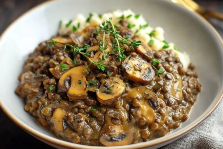 Ein cremiges Linsen-Pilz-Stroganoff mit herzhaften Champignons, zarten Linsen und einer würzigen, sämigen Sauce – ein echtes vegetarisches Wohlfühlgericht, das perfekt zu Kartoffelpüree, Reis oder Nudeln passt und sich ideal als sättigendes Abendessen für die ganze Familie eignet.